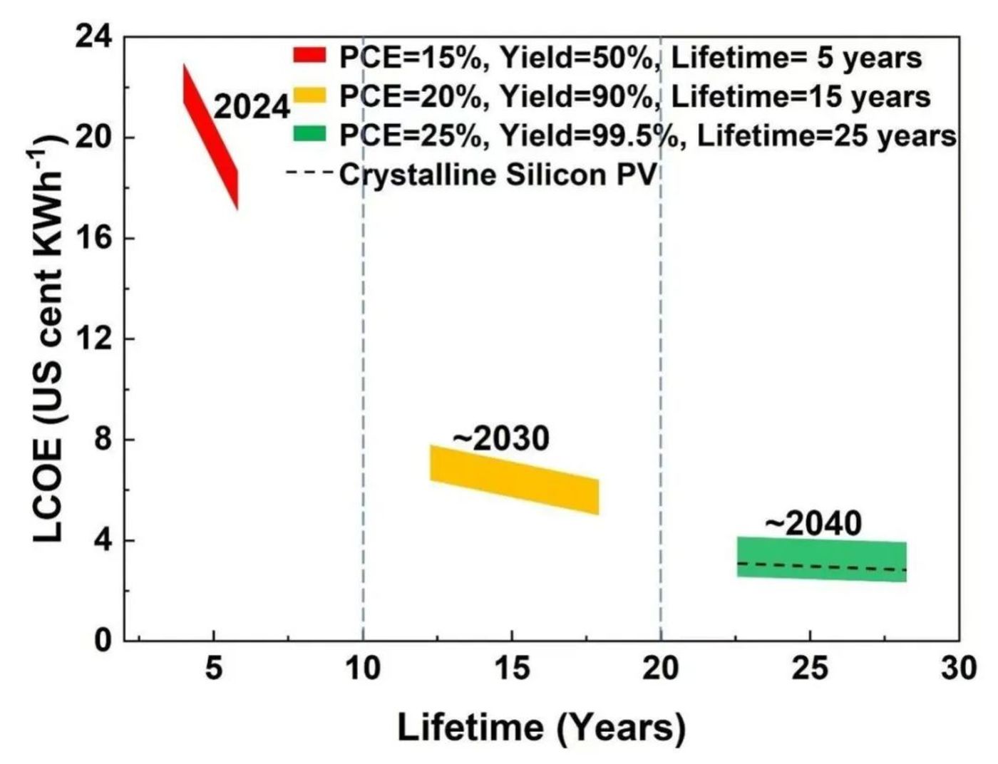 (一)按当前钙钛矿转换效率15%、产品良率为50%、组件寿命5年推测,对应度电成本18-22美分/kWh。在该成本下除用于展示外,大规模商业化寸步难行。