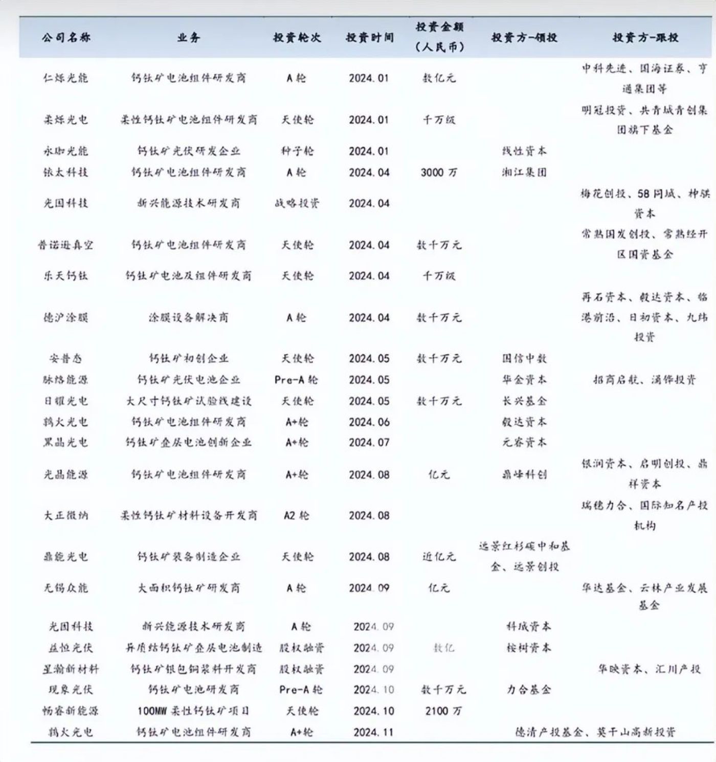 (2024年以来钙钛矿企业融资)