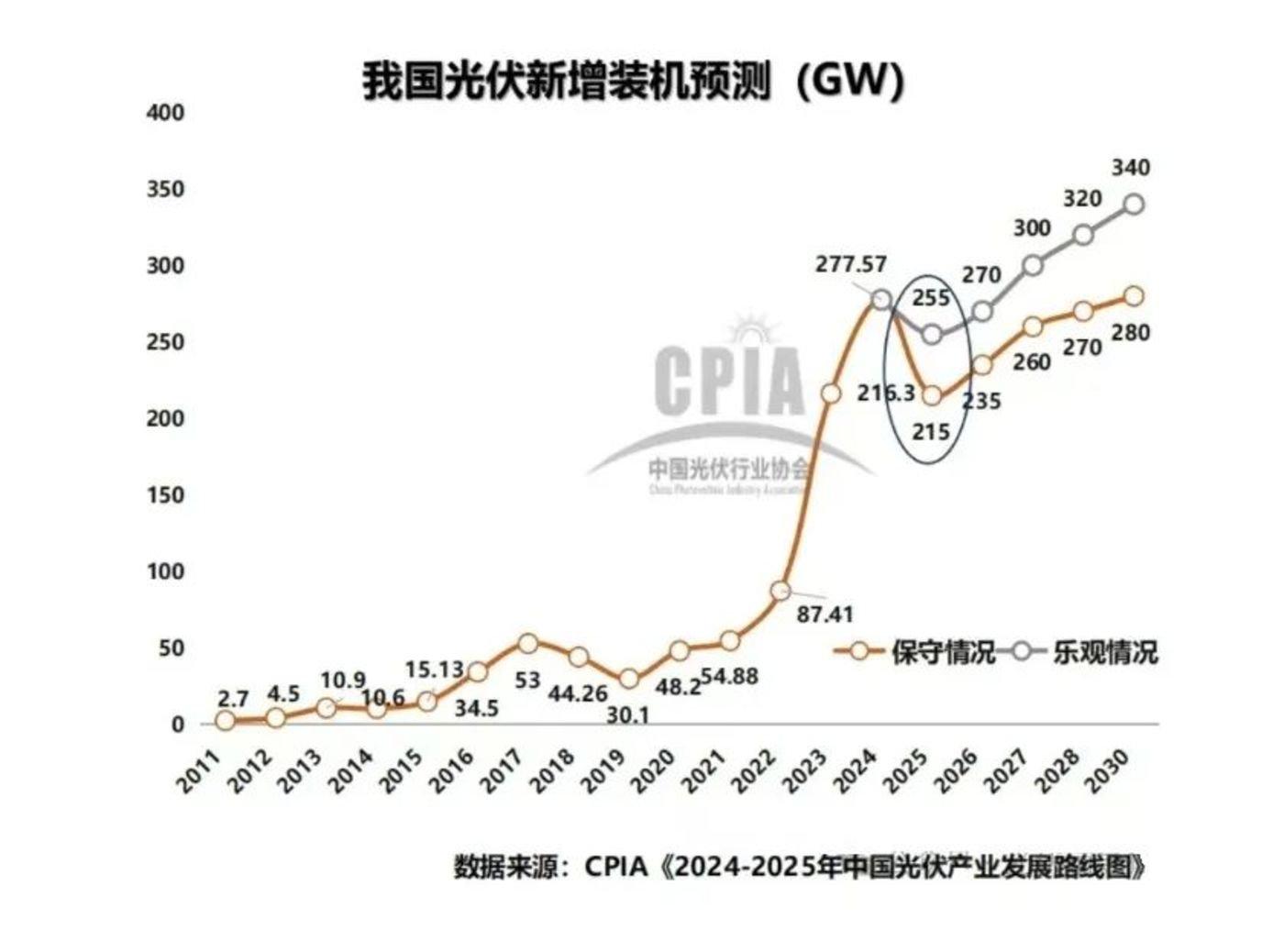因光伏“抢装”,今年1-5月我国光伏新增装机量197.85GW,同比增长149.97%。光伏行业协会预测“抢装”过后,后续各月装机量将有所放缓,全年新增装机量或弱于2024年水平。若按中国光伏协会保守判断,2030年国内光伏新增装机量也仅是与2024年持平。