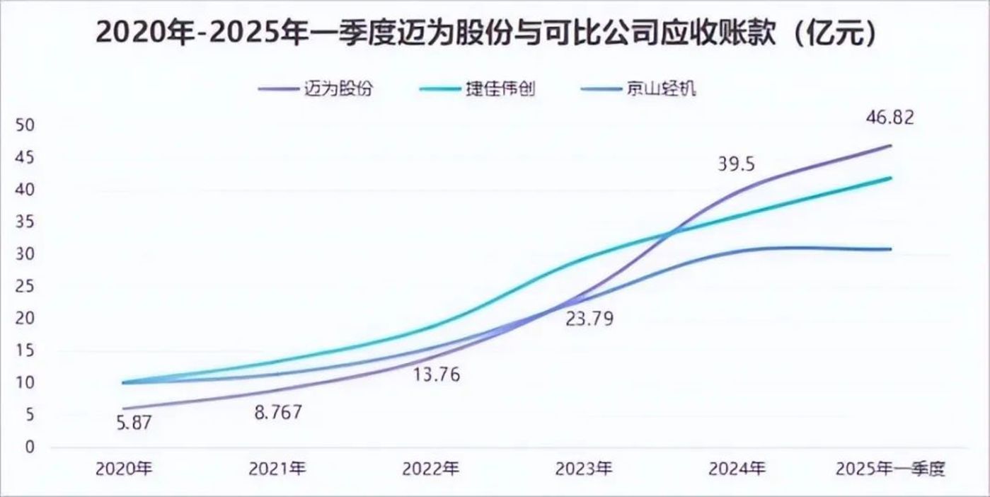 2023年以来,迈为股份应收账款余额增速快于捷佳伟创、京山等光伏设备可比同行。2024年底,迈为股份应收账款账面价值约39.5亿元,占公司当年营业收入的40.18%。2025年一季度,迈为股份应收账款再增至46.82亿,公司应收账款增速比营收增速快得多。