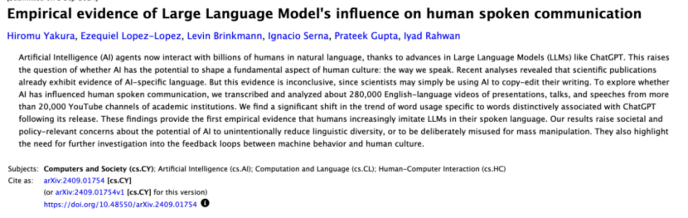 研究人员进一步指出,AI正在决定什么是“正确的”“标准的”英语。而当我们周围每个人的说话都开始听起来“标准无误”,我们也就随之失去了那些口误、俚语、带点走音的语句——而这些恰恰是脆弱、真实和“人性”本身的信号。