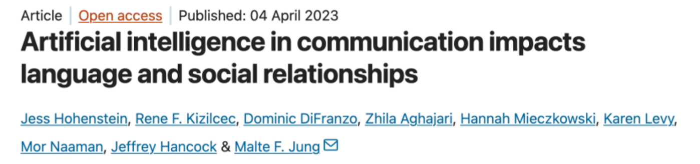 康奈尔大学的一项研究发现,当两个人在文字聊天,一方使用AI来回复,往往效果很好,因为AI给出的回复是很正面的。但这仅限于一方完全不知道对方用了AI,且对此没有怀疑的情况下。