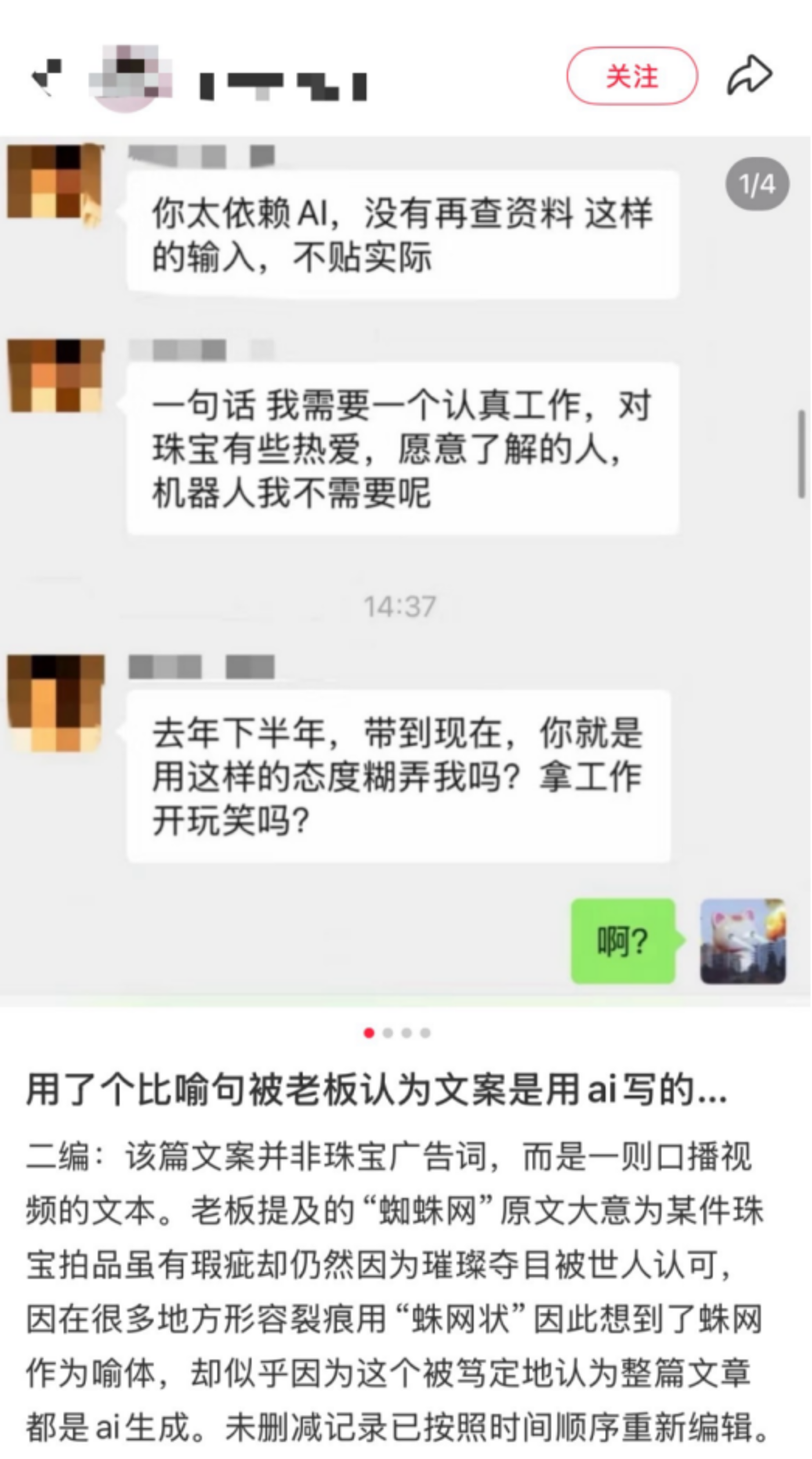 小红书用户@椰汁糕不睡了就分享,自己写的口播视频文案,因为用了“蜘蛛”这个意象,被老板指责“你太依赖AI”“我需要一个认真工作、对珠宝有些热爱、愿意了解的人,机器人我不需要”。让她百口莫辩。