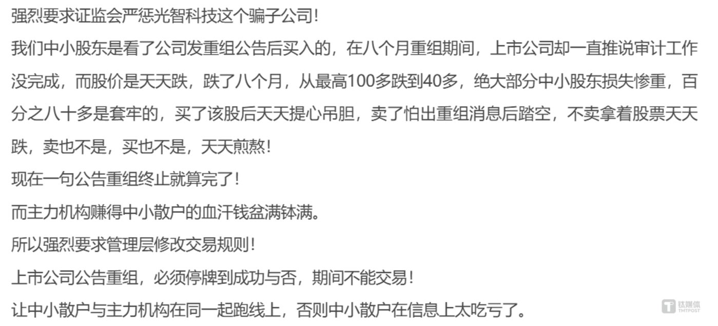需要指出的是,光智科技凭借重组造成股价大幅波动,令不少中小投资者损失颇重。互动平台上“忽悠式重组”“圈钱”等质疑声此起彼伏,股吧中更有投资者直言“强烈要求证监会严惩光智科技这个骗子公司”。