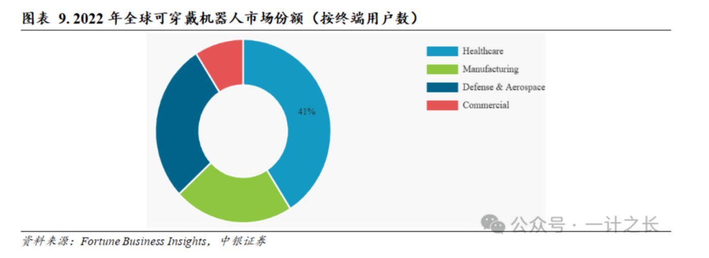 而登山、户外领域只是外骨骼应用的一个小方面。根据下图数据可知,全球可穿戴外骨骼机器人中医疗领域占比最高,约41%,随后是制造业、国防航空、商业等领域。