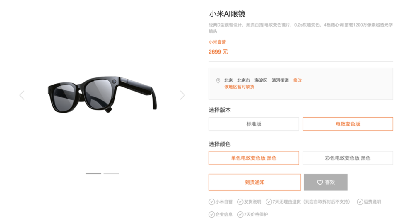 第二,一些显性卖点的更新,能够吸引更多用户尝鲜购买。小米AI眼镜的三款产品中,话题度和热度更高的是两款电致变色版本的产品。虽然电致变色产品不支持配带有度数的镜片,且价格要比标准版贵至少700元,但在小米的线上线下渠道中也都已经售罄。我们在抖音看到非科技博主展示的,也往往是这两款眼镜。