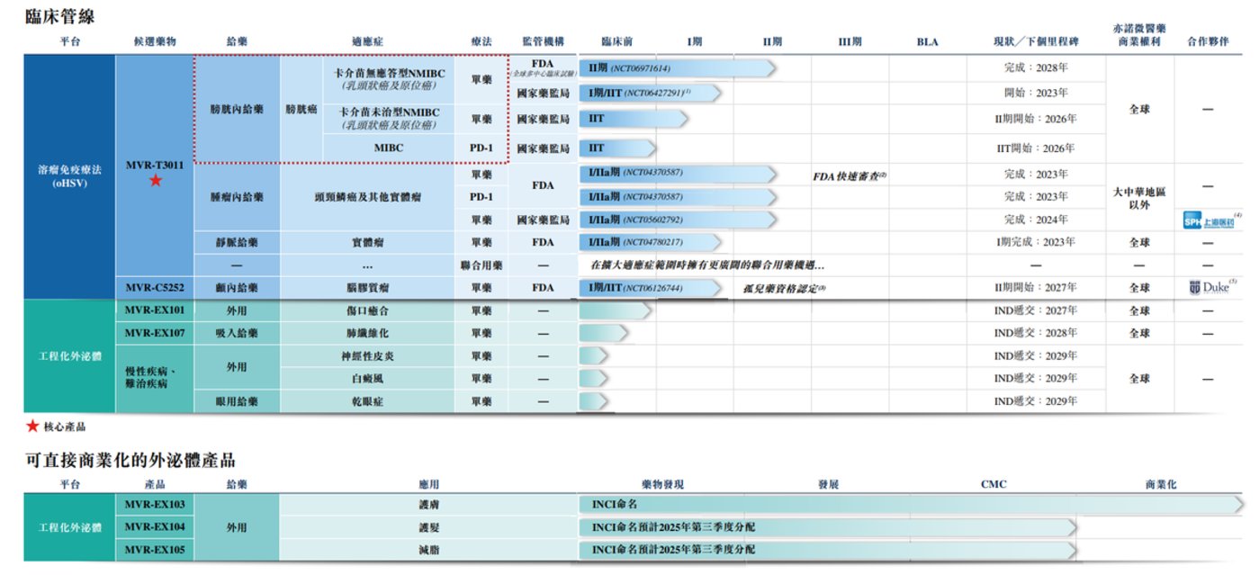 其中,核心产品MVR-T3011是一种基于HSV-1(单纯疱疹病毒1型)的新型溶瘤免疫疗法,通过将强效的肿瘤裂解与表达抗PD-(L)1抗体和IL-12相结合,靶向治疗全谱系膀胱癌及包含头颈鳞癌的更广泛实体瘤类型。