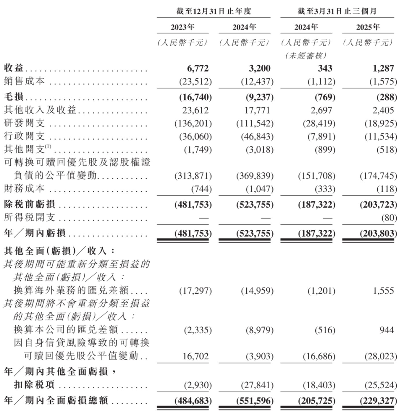 根据招股书,2023年、2024年及2025年一季度,亦诺微医药收益分别为677.2万元、320.0万元、128.7万元;期内亏损分别为4.82亿元、5.24亿元、2.04亿元。其中营收下降、亏损扩大趋势比较明显,反映出比较骨感的现实。