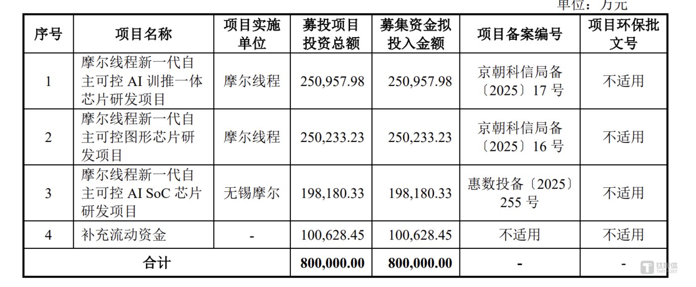 招股书显示,本次发行前,公司总股本为40,002.8217万股,本次IPO拟向社会公众发行不低于4,444.7580万股普通股(不含因行使超额配售选择权增发的股份),筹资总额超过80亿元。其中,62%的资金用于研发摩尔线程新一代自主可控 AI 训推一体芯片、新一代自主可控图形芯片;剩余38%的资金用于新一代自主可控 AI SoC 芯片研发项目,以及补充流动资金。