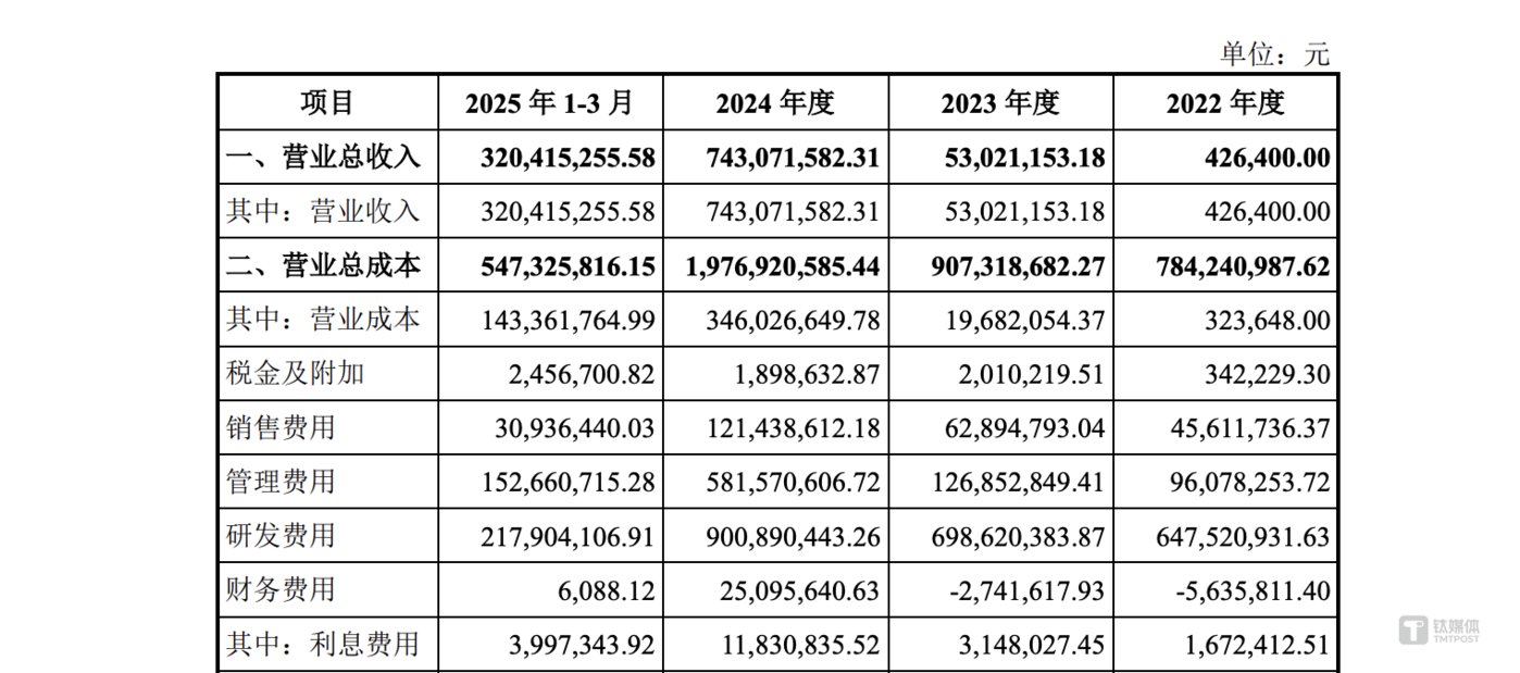 招股书显示,2022年、2023年、2024年和2025年1-3月,沐曦股份营业收入分别为42.64万元、5302.12万元、7.43亿元和3.20亿元;归属于母公司所有者的净利润分别为-7.77亿元、-8.71亿元、-14.09亿元、-2.33亿元,尚未实现盈利。