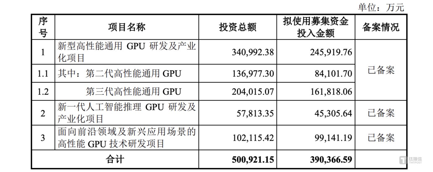招股书显示,发行人本次发行前的总股本为36,000.00万股,如本次公开发行股票数量为4,010.00万股,占发行后总股本的10.02%,筹资39.04亿元,投资总额超过50亿元。筹得资金当中,62%的资金用于第二代、第三代高性能通用GPU等下一代通用GPU芯片研发和产业化项目;11%的资金用于下一代AI推理GPU研发;剩下资金用于前沿领域及新兴应用场景的高性能GPU技术研发。