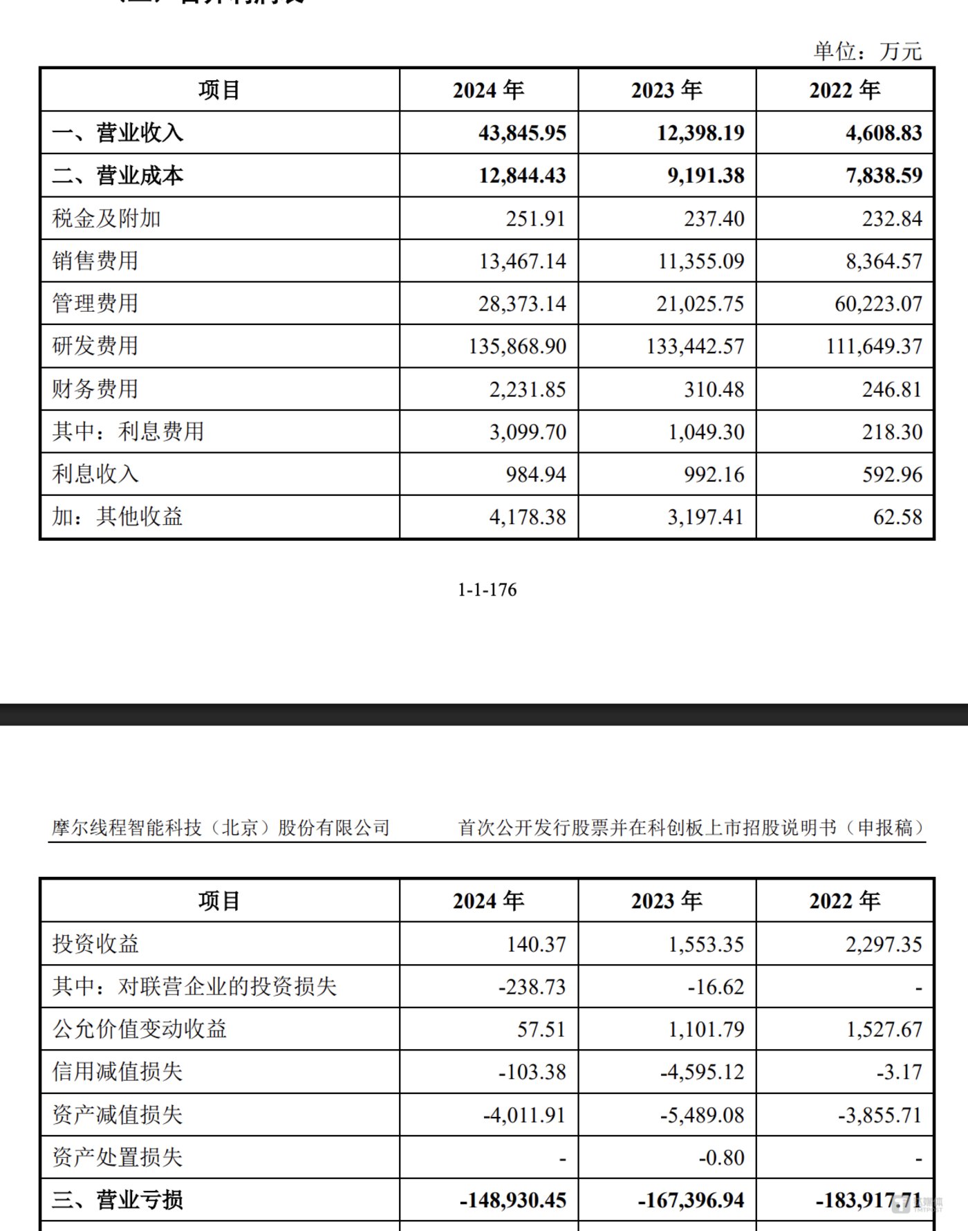 收入方面,摩尔线程处于早期收入较小、长期亏损状态。