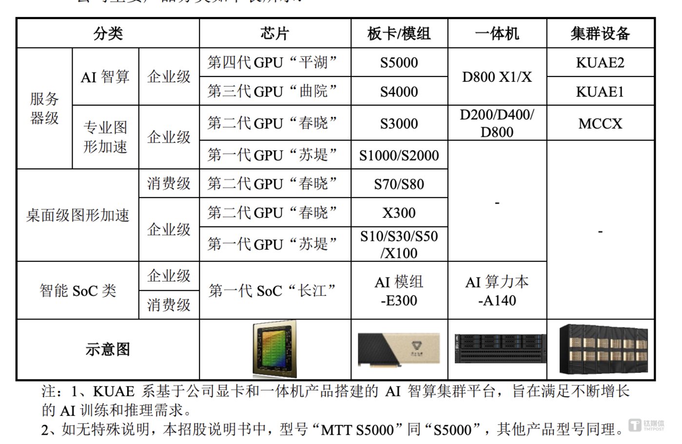 业务方面,基于自主研发的 MUSA 架构,公司成功开发出支持 AI 计算加速、图形渲染、物理仿真和科学计算、超高清视频编解码等多场景的全功能GPU芯片。公司四年推出四代GPU芯片架构、四颗GPU芯片系列——苏堤、春晓、曲院和平湖,流片成功/发布时间分别是2021年、2022年、2023年和2024年,覆盖 AI 智算、专业图形加速及桌面级图形加速等领域,主要生产方式包括板卡/模组、一体机、集群设备等。