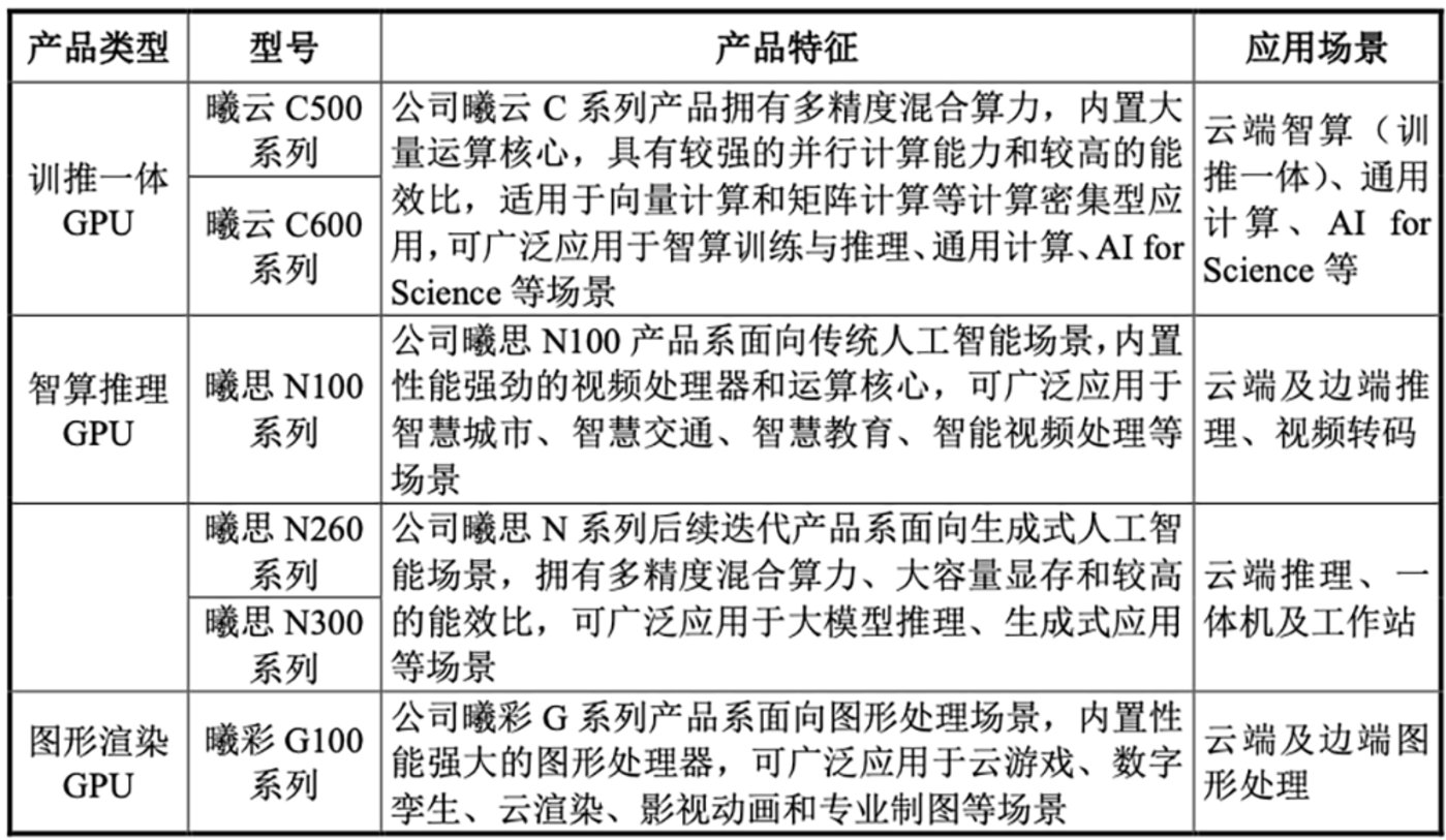 业务方面,沐曦股份的主要产品全面覆盖人工智能计算、通用计算和图形渲染三大领域。过去三年多时间,沐曦股份只用一颗GPU芯片,先后推出了用于智算推理的曦思 N 系列 GPU、用于训推一体和通用计 算的曦云 C 系列 GPU,以及正在研发用于图形渲染的曦彩 G 系列 GPU。基于自主研发的GPU IP 与统一的 GPU 计算和渲染架构,沐曦产品在通用性、单卡性能、集群性能及稳定性、生态兼容与迁移效率等方面具备较强的核心竞争力。