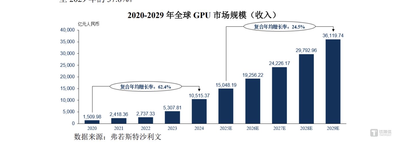 其中,从AI芯片市场看,国内AI计算加速芯片的市场规模实现快速增长。据弗若斯特沙利文预测,到2029年,中国AI芯片市场规模将从2024年的1425.37亿元,激增至13367.92 亿元,2025年至2029年 期间年均复合增长率为 53.7%。从细分市场上看,GPU的市场增长速度最快,其市场份额预计将从2024年的69.9%,上升至2029年的 77.3%。