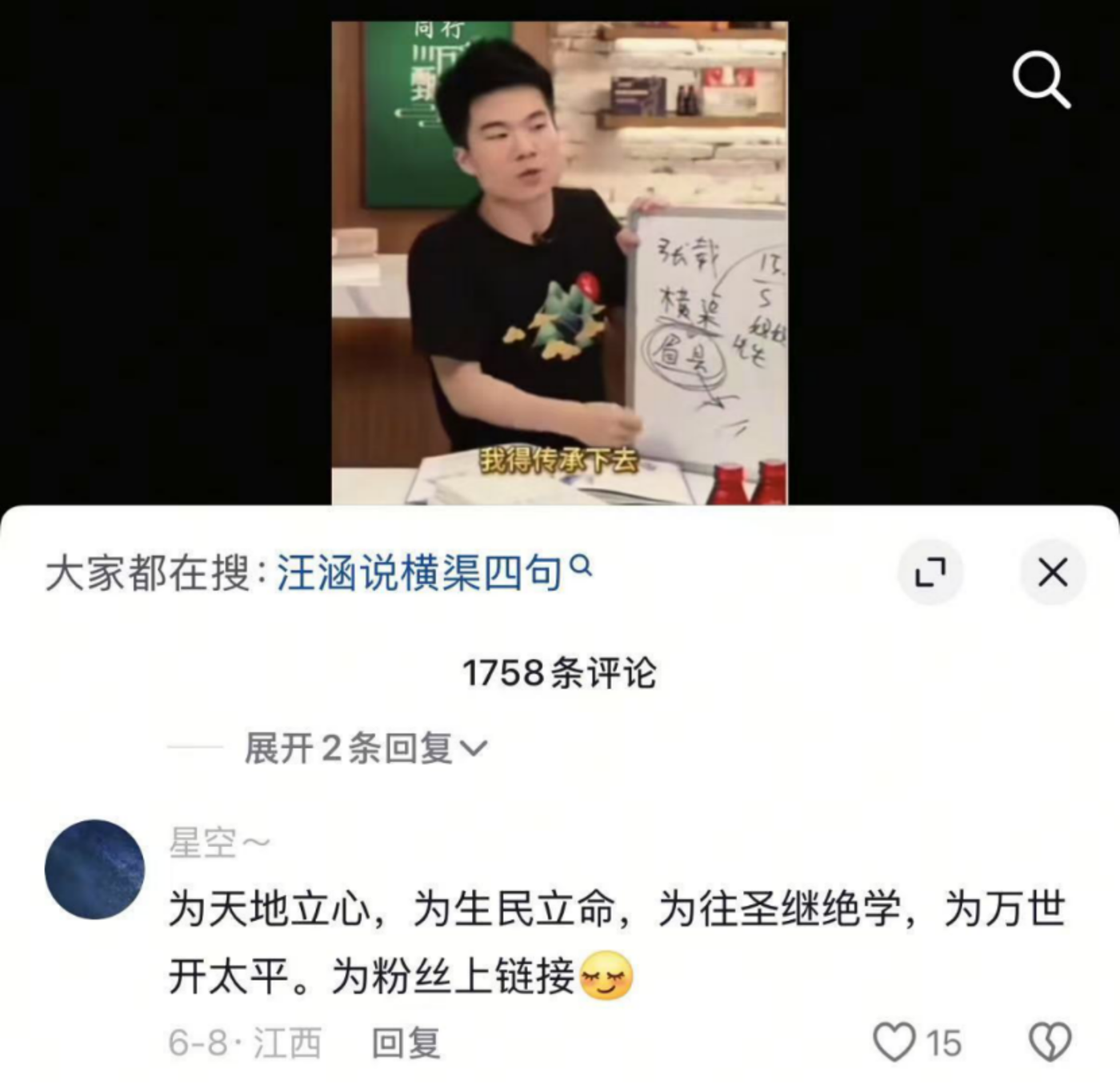 有人直接在董宇辉讲解“横渠四句”的视频底下留言,将“四为句”(即横渠四句)改为“五为句”,在后面接上一句“为粉丝上链接”。