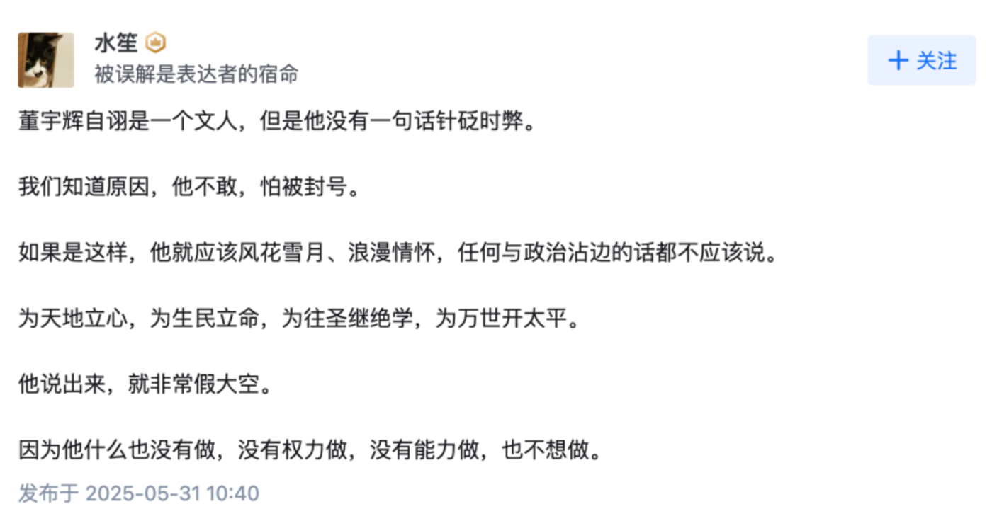但是在他们看来,董宇辉的行为和这句话的内核不相符,也就不配说。