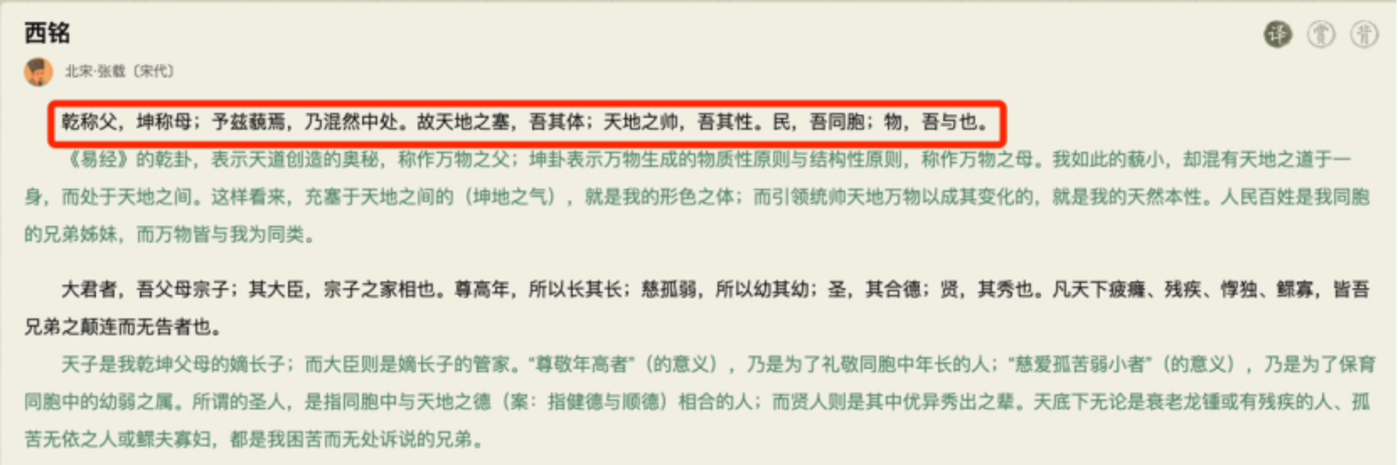 理解“横渠四句”还需了解张载的哲学观,张载在《西铭》中写道,“乾称父,坤称母……民,吾同胞,物,吾与也”。意思是,天地可称之为“我”的父母,而天下的民众则为“我”的同胞,也就是天下万物、宇宙中的一切均与“我”有关。