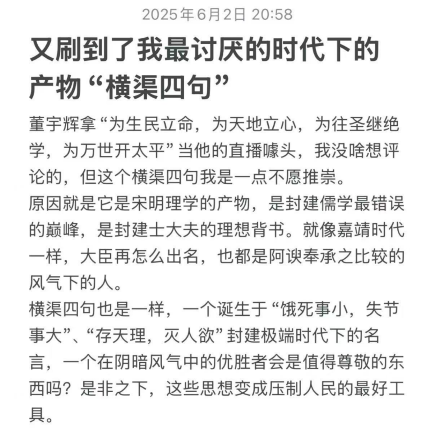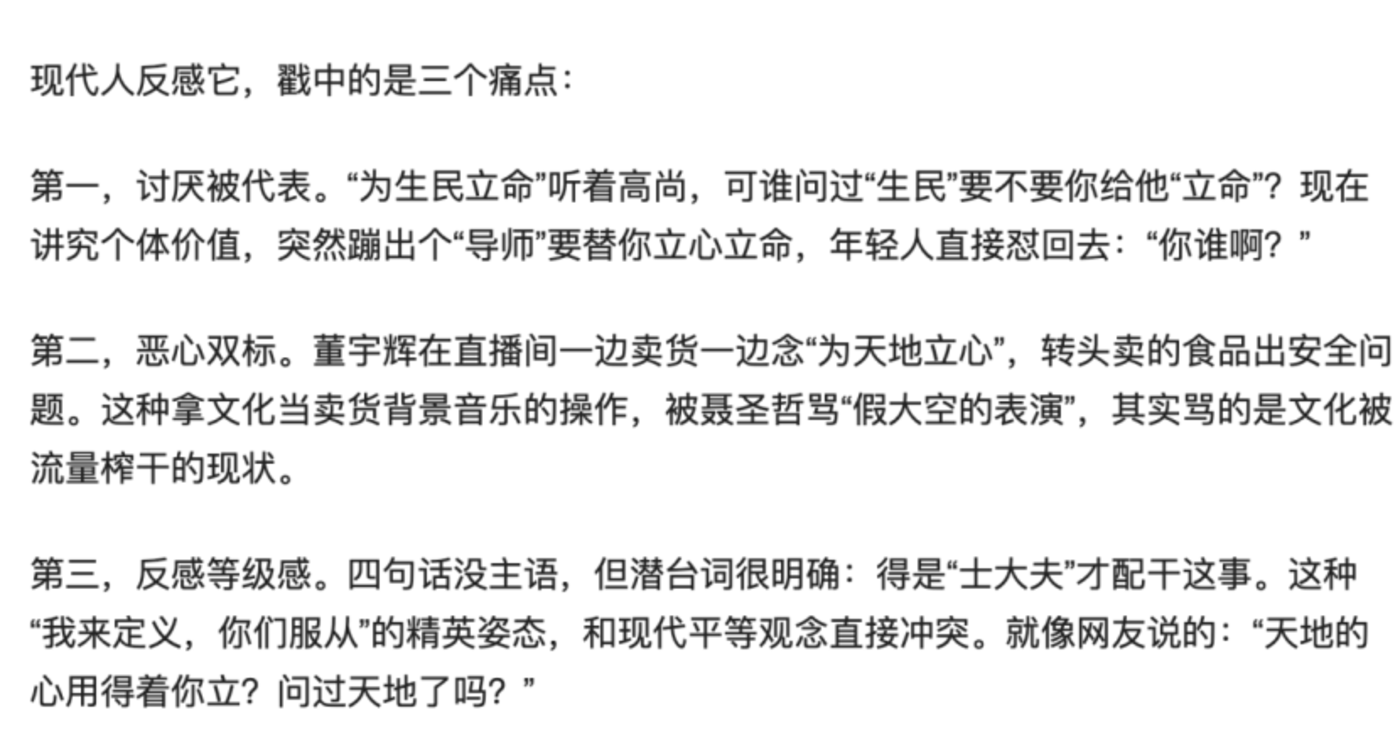 如果说,上述对横渠四句的探讨集中在董宇辉的个人行为是否配得上“横渠四句”,那么后续的探讨已经脱离董宇辉本人,上升到对“横渠四句”本身的文化探讨。