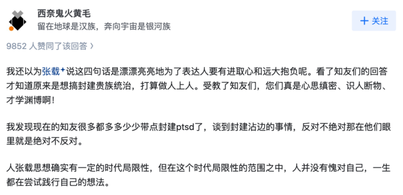 对“横渠四句”的解读,早已成为一个持续不断的讨论。在知乎上,有一个问题是,“讨厌‘为天地立心,为生民立命,为往圣继绝学,为万世开太平’这四句的人都是怎样的想法?”