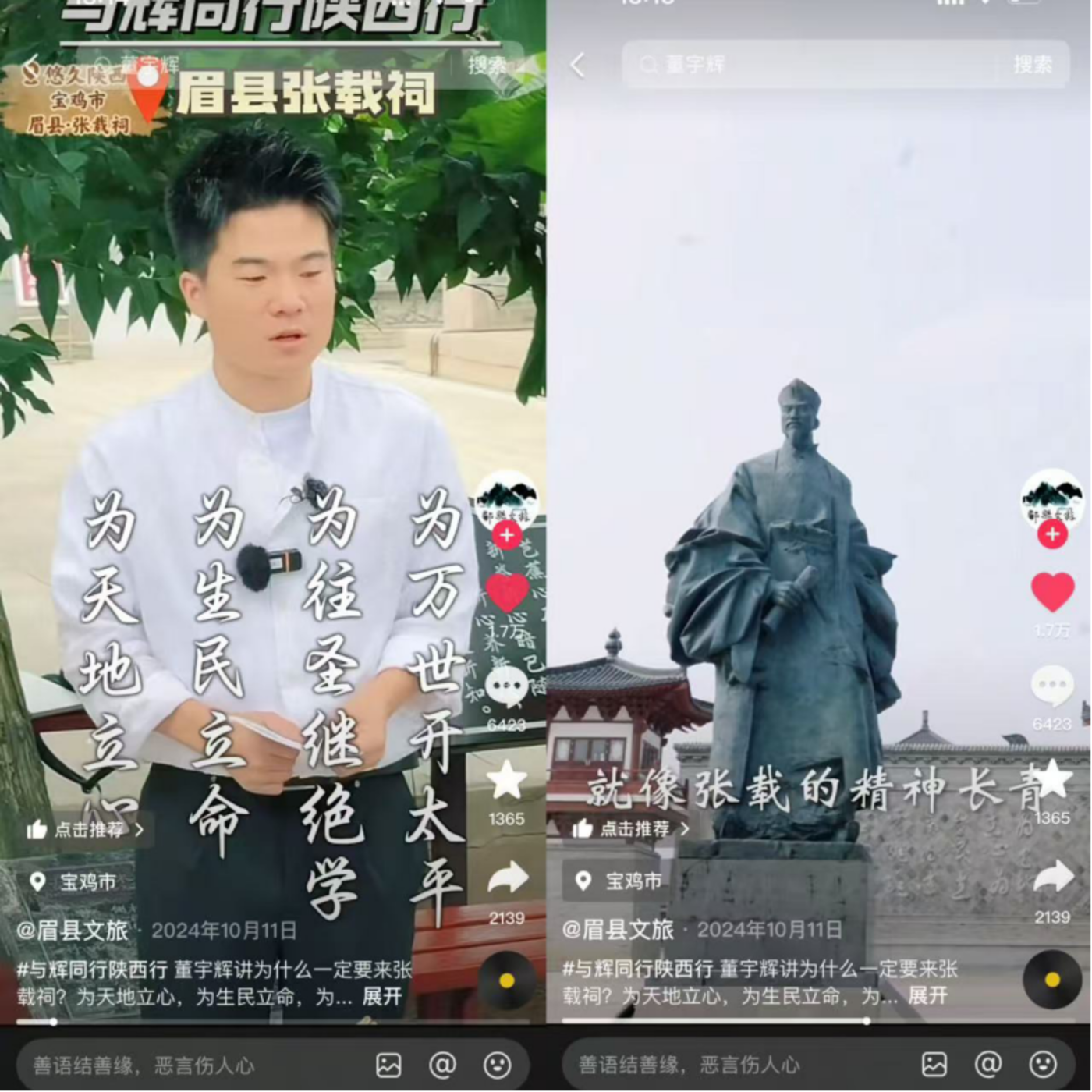 最近一次是2024年10月,董宇辉在陕西眉县推广文旅时,在位于眉县横渠村的张载祠讲到了横渠四句。据“眉县文旅”发布的抖音视频,董宇辉是这样讲解的: