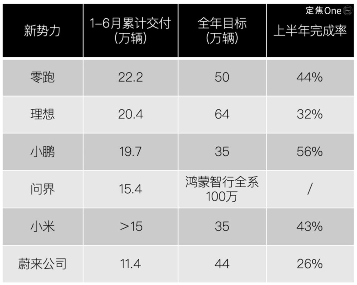 蔚来三大品牌上半年合计交付11.4万辆,目标完成率26%,在新势力中暂时落后。