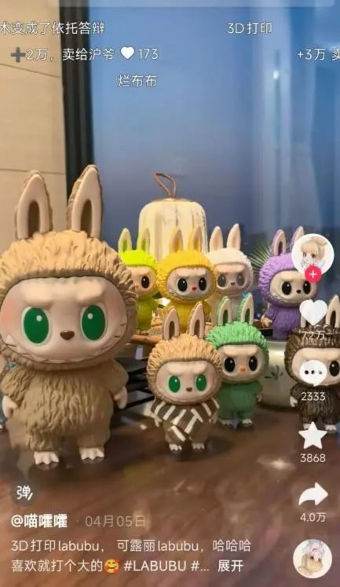 “3D打印一不小心实现了LABUBU自由”、“喜欢就打个大的”,在社交媒体平台上,不少网友已经晒出自己用3D打印的LABUBU模型,相关作品引发上完点赞和转发。