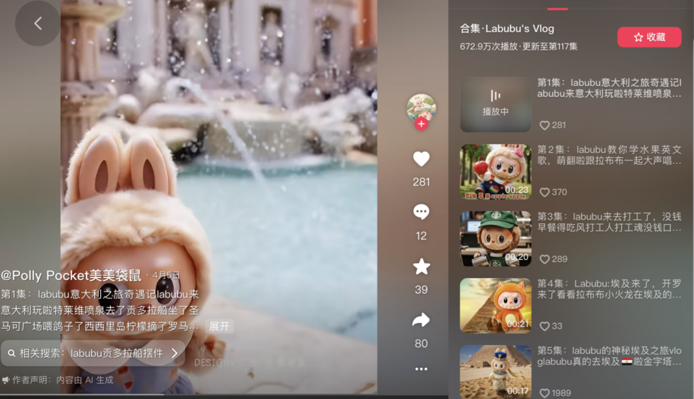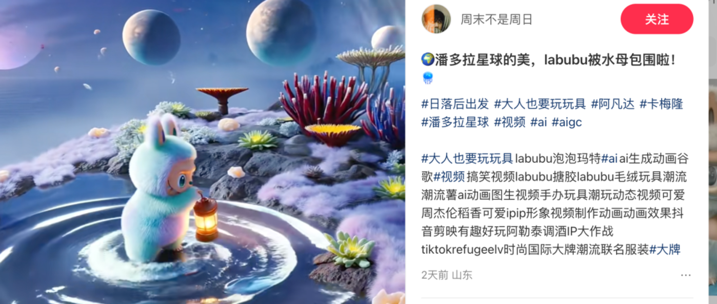 如,由AI生成的“LABUBU眨眼龇牙”“偷偷摸摸溜墙角”等小动作,将其“凶萌”特质具象化,比静态玩偶更具感染力。