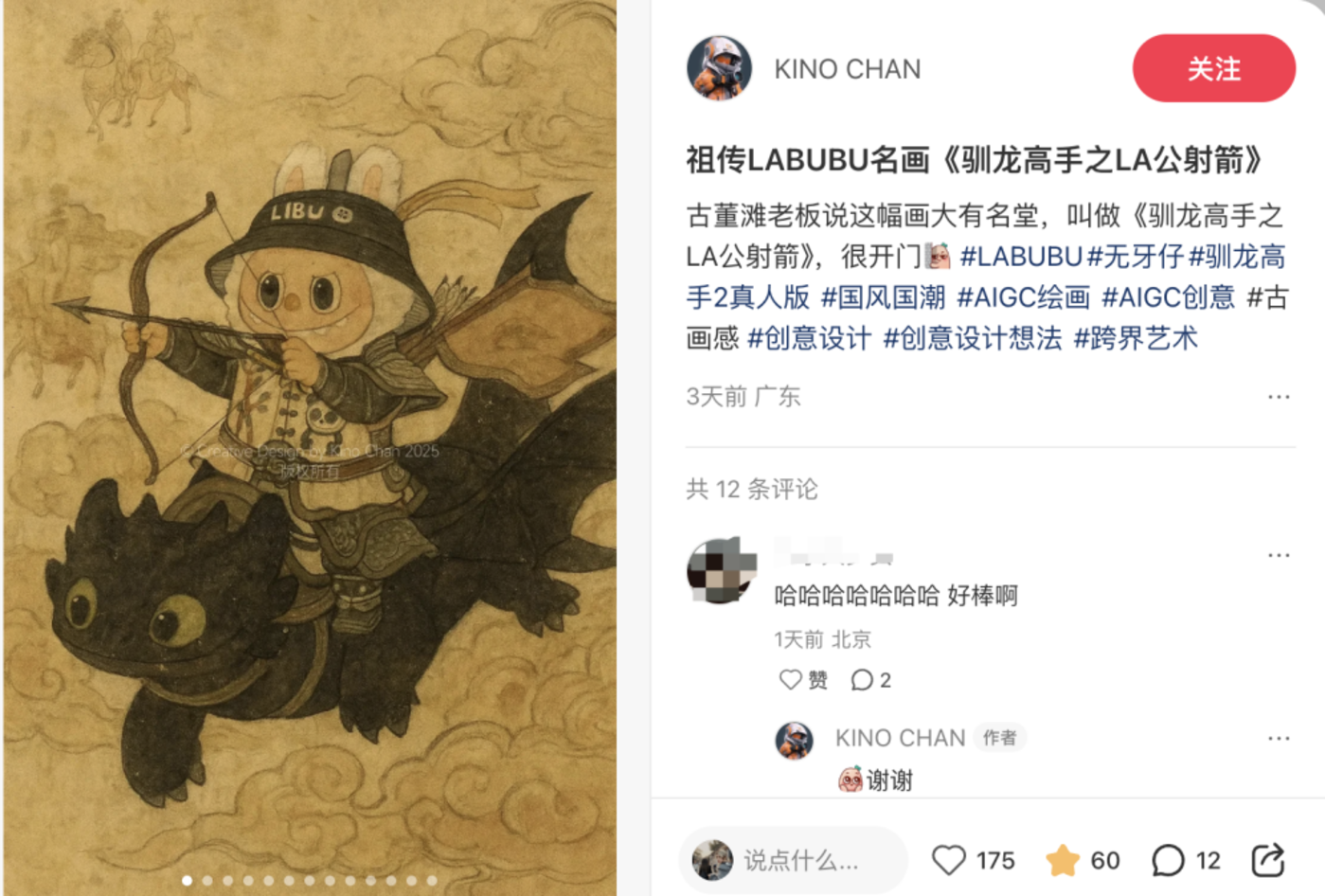 LABUBU x 《驯龙高手》:将LABUBU融入到驯龙高手的动画绘本中,带入国风创意形成的《驯龙高手之LA公射箭》收藏价值拉满,“古董摊老板说这幅画大有名堂。”
