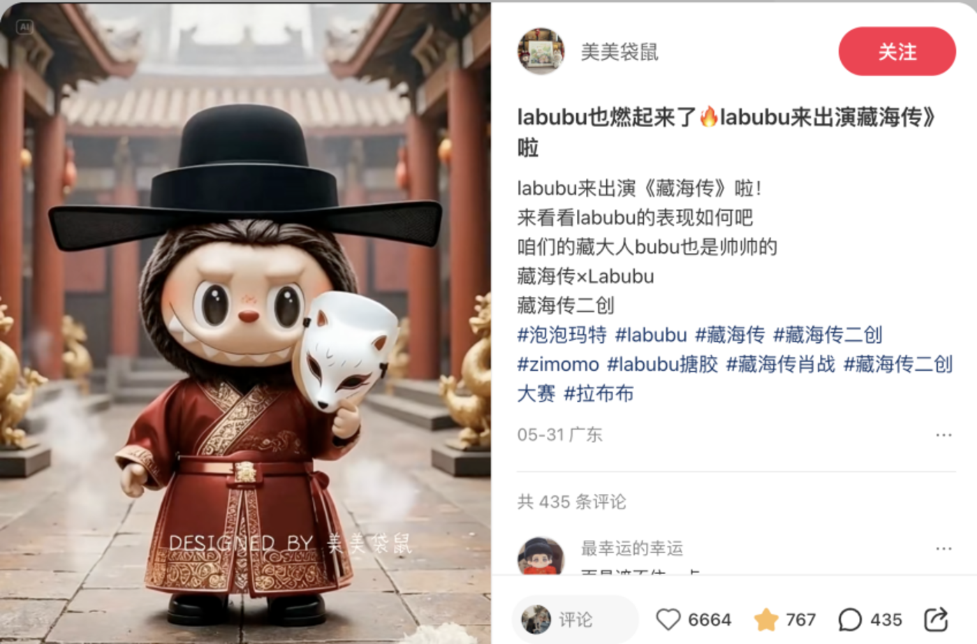 LABUBUx《藏海传》:有网友通过AIGC二创了LABUBU出演《藏海传》的情节,在小红书上引发了上千点赞。