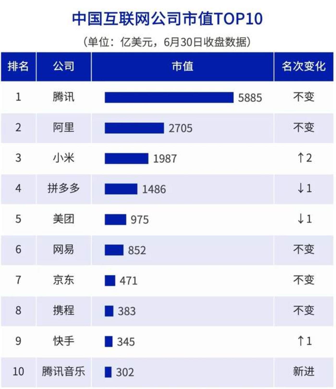 从市值看,腾讯以5885亿美元继续领跑,阿里2705亿美元大约是腾讯的一半,小米1987亿美元大约是腾讯的三分之一。虽然,阿里、小米和腾讯还有不小差距,但这两家公司分别在AI、汽车方向上找到了新机会,继续缩小差距的可能性很大。