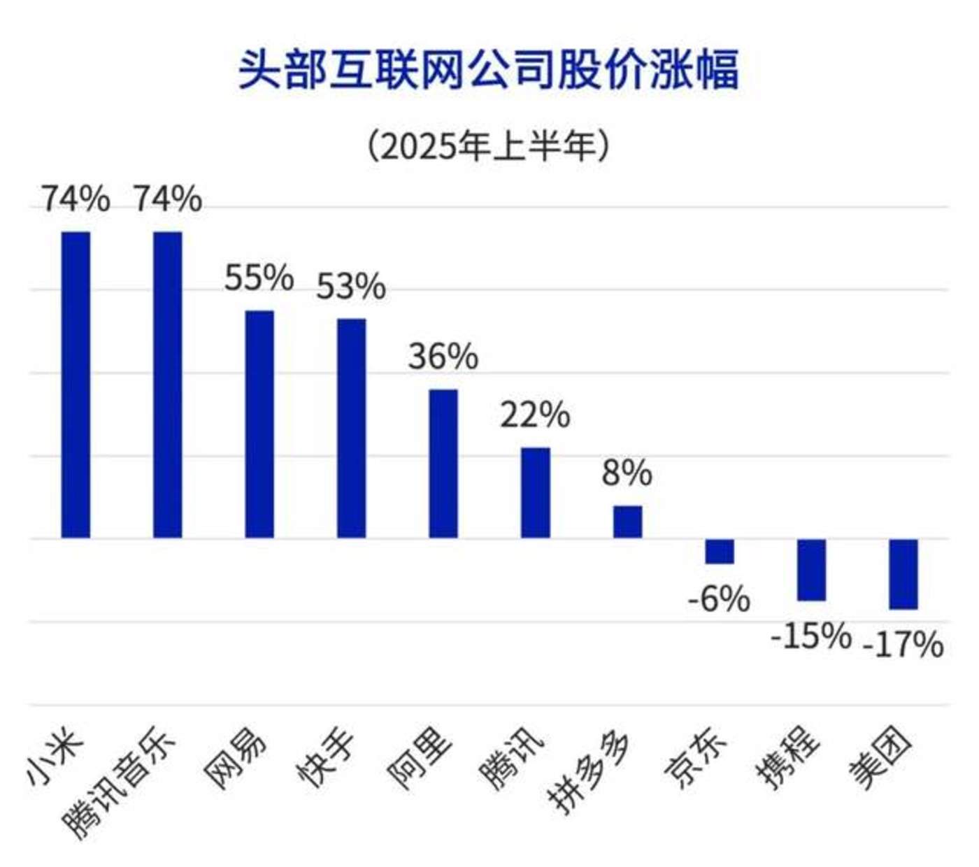 从2025年上半年的股价涨幅看:小米、腾讯音乐涨幅高达74%;网易、快手涨幅分别是55%、53%;阿里、腾讯涨幅跑赢恒生科技指数(19%);拼多多涨幅只有8%;美团、携程、京东分别下跌17%、15%和6%。