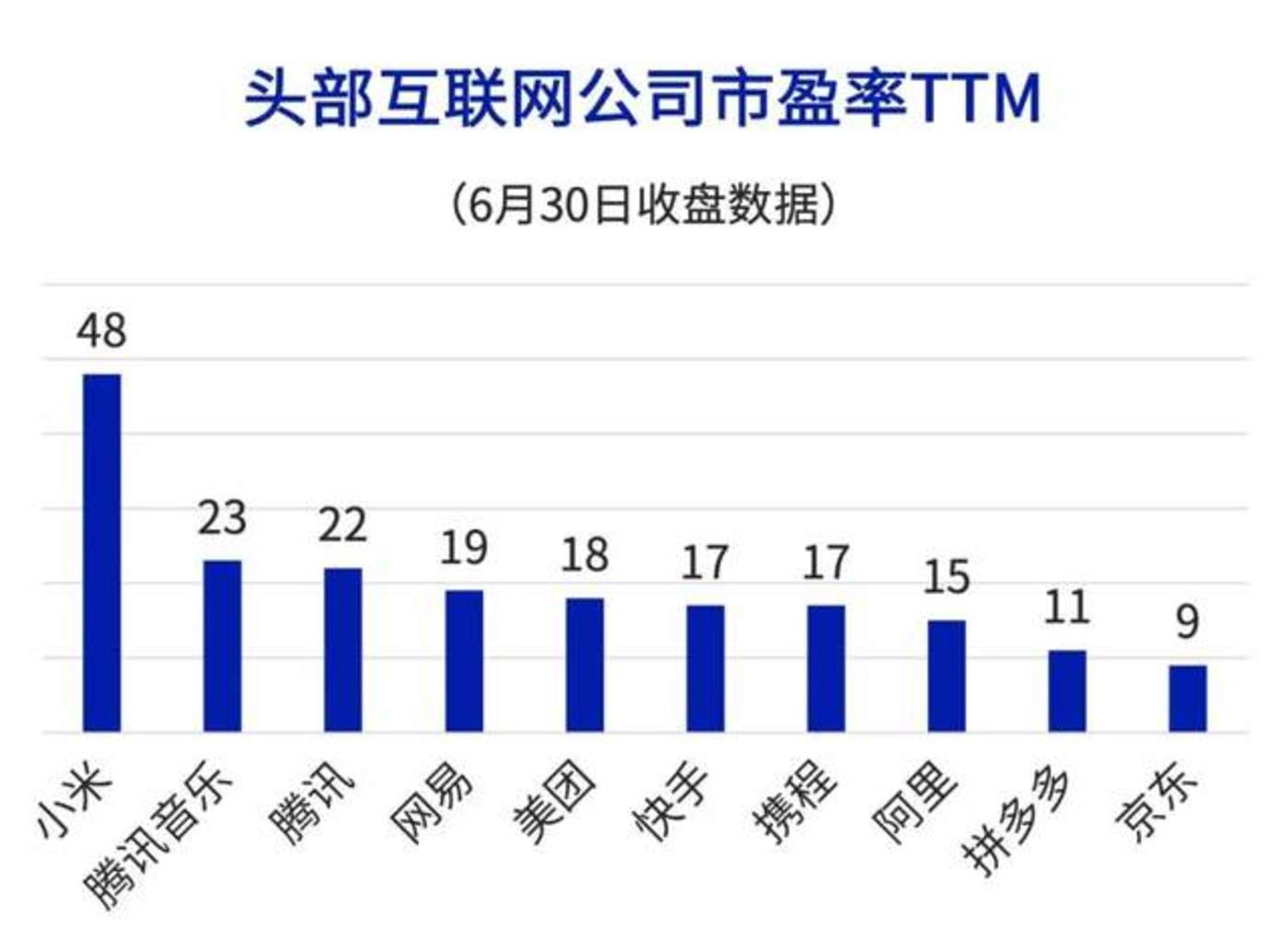 汽车业务带来了高增长预期,所以小米享受着远超其他互联网巨头的市盈率(48倍)。
