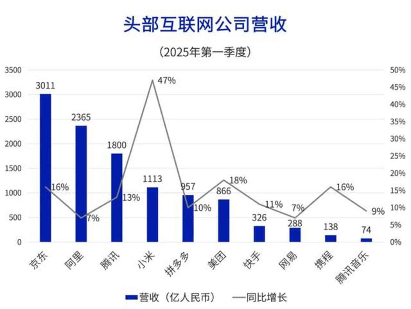 自营模式为主的京东仍然是营收之王,一个季度营收3011亿元。超过千亿的还有三家,分别是:阿里、腾讯、小米。