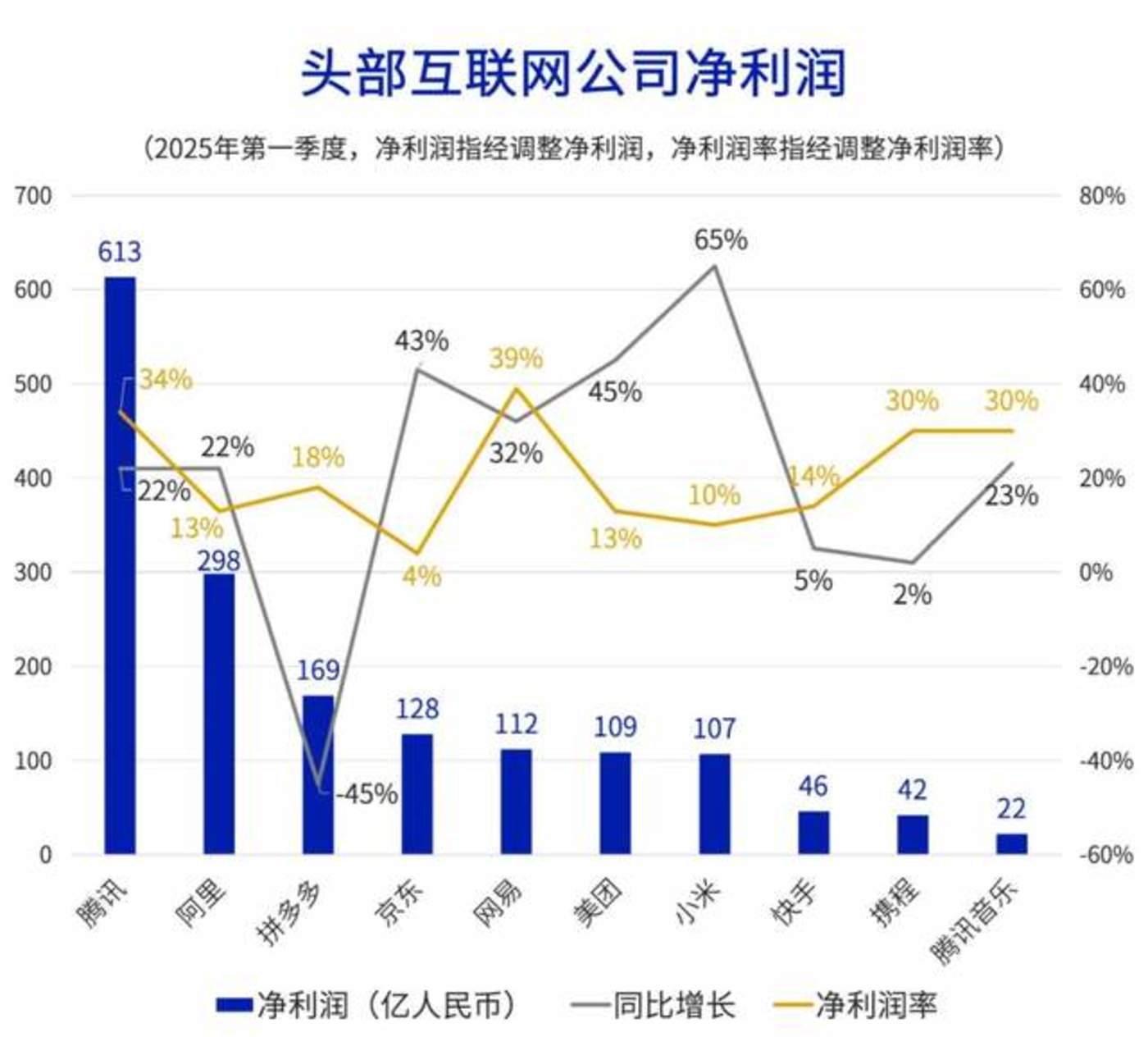 同样是赚钱,有的公司几乎躺赚,有的公司赚的是辛苦钱。净利润率可以反映差距,以游戏为主业的网易、腾讯,净利润率分别高达39%、34%;携程、腾讯音乐等垂直赛道的绝对龙头,净利润率也都达到了30%;电商平台为主业的阿里和拼多多,净利润率分别是13%、18%;相比之下,在各自赛道面临激烈竞争的美团、小米,虽然行业地位出众,但净利润率暂时得不到释放;赚钱最“难”的是京东,营收虽是第一,有国补加持的大背景下,净利润只能排第四,根源还是自营模式成本高、利润空间小,整体净利润率只有4%。