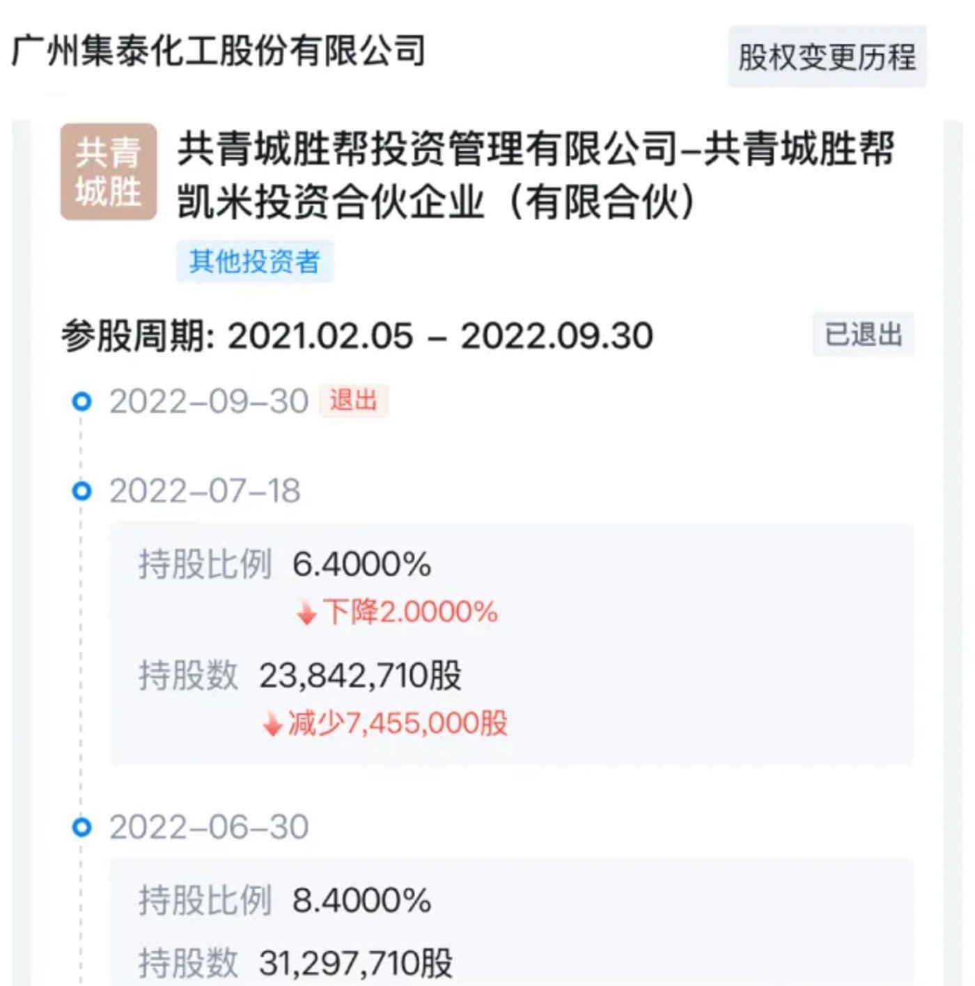 比如,集泰股份(002909.SZ)定增,胜帮凯米投资认购2235万股,持股比例8.39%,成为公司第二大股东。彼时的公开说法是,“陕煤参与定增不仅仅是财务性投资,同时未来可能积极参与公司治理,并提供一定的资源支持或潜在业务机会。”讲话的呵气余温尚在,胜帮凯米就开动“减持机器”,一年多时间就完成退出。