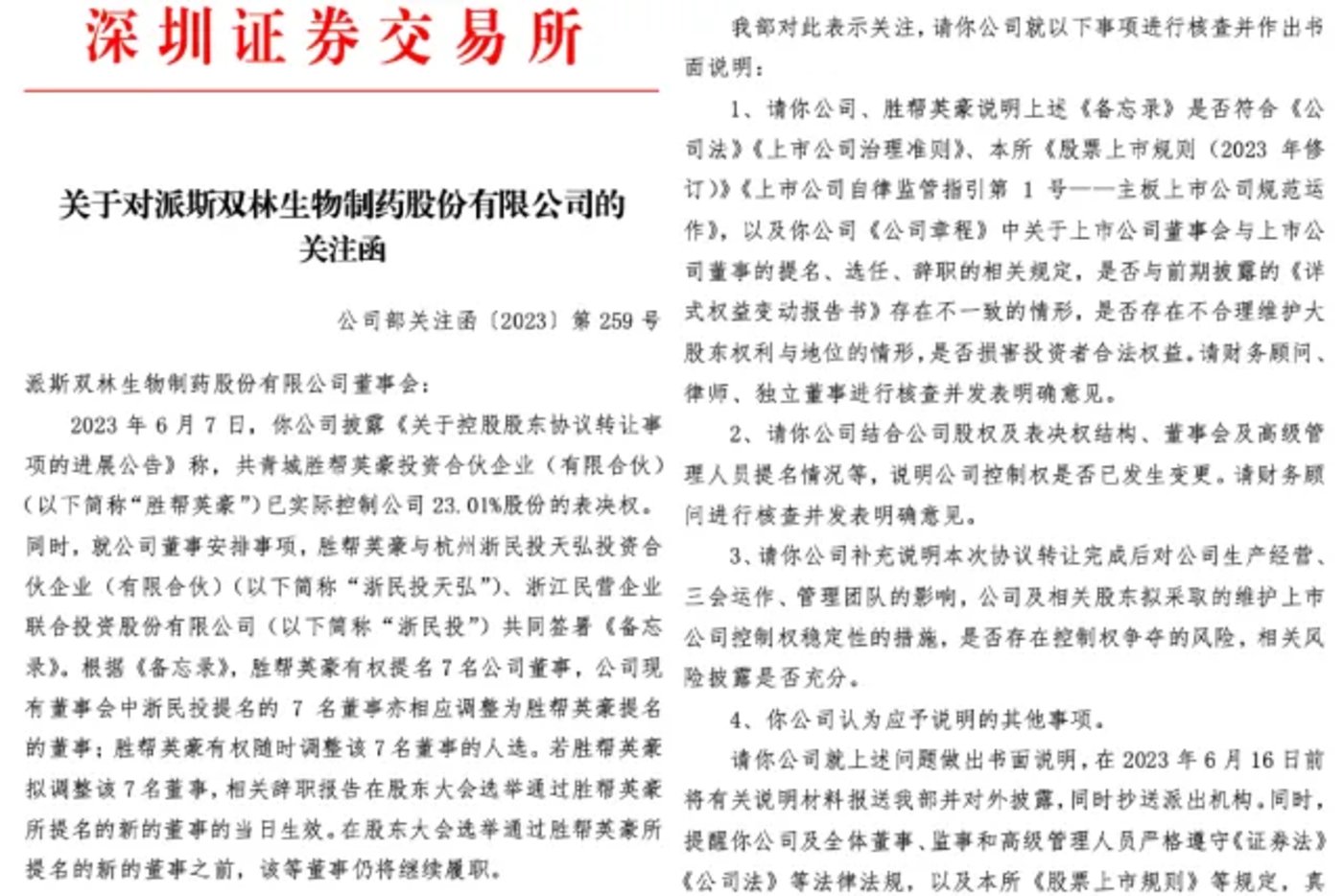 对于监管的“敲警钟”,“胜帮系”仅以形式化的回应作答了事,现实却没有回复问询那么容易“抹”过去。胜帮系入主派林生物后,与哈尔滨方面的二股东冲突迅速白热化。从法律对抗到公开声讨,双方围绕控制权争夺、公司治理等多个层面展开激烈博弈,“胜帮系”虽有股权优势,最终仍不得不以“董事长+联席董事长”架构予以妥协。