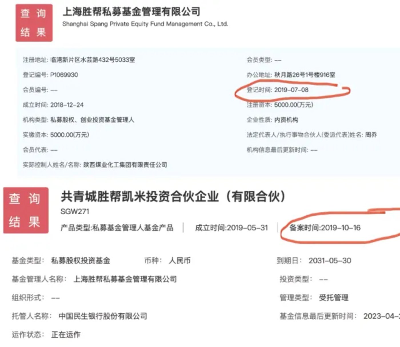 几乎与新三板摘牌同步发生的,是两家设立不久的“胜帮系”投资管理、股权合伙企业相继备案两支私募基金(备案时间分别在2019年7月、10月)。