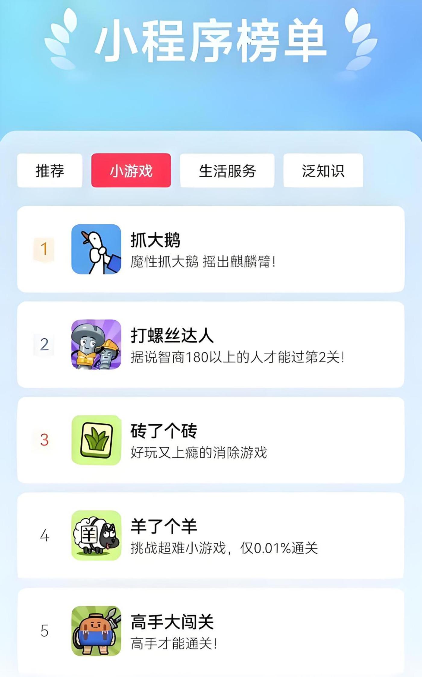 关于小游戏从小众走向全民的记忆,最早可追溯到2017年底爆火的微信小游戏《跳一跳》;2022年,《羊了个羊》在社交平台迅速传播,成为现象级小游戏;时间继续向后,抓大鹅、折螺丝等爆款小游戏相继出圈。