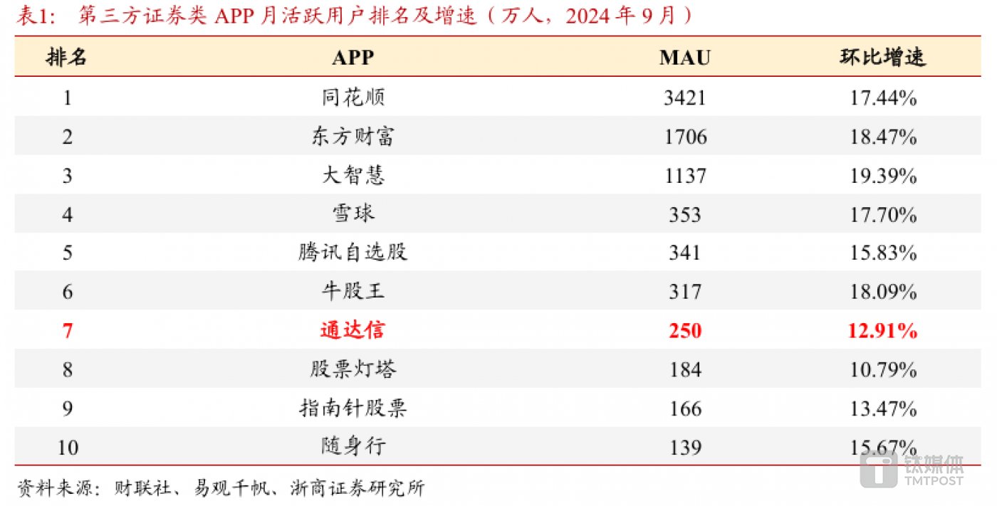 这种“佛系”的运营方式,导致公司C端业务起了个大早,却赶了个晚集。截至2024年9月,通达信APP的月活跃用户数(MAU)仅为约250万。这个数字在第三方证券类APP中排名第7,远低于月活数千万的同花顺、东方财富等巨头。
