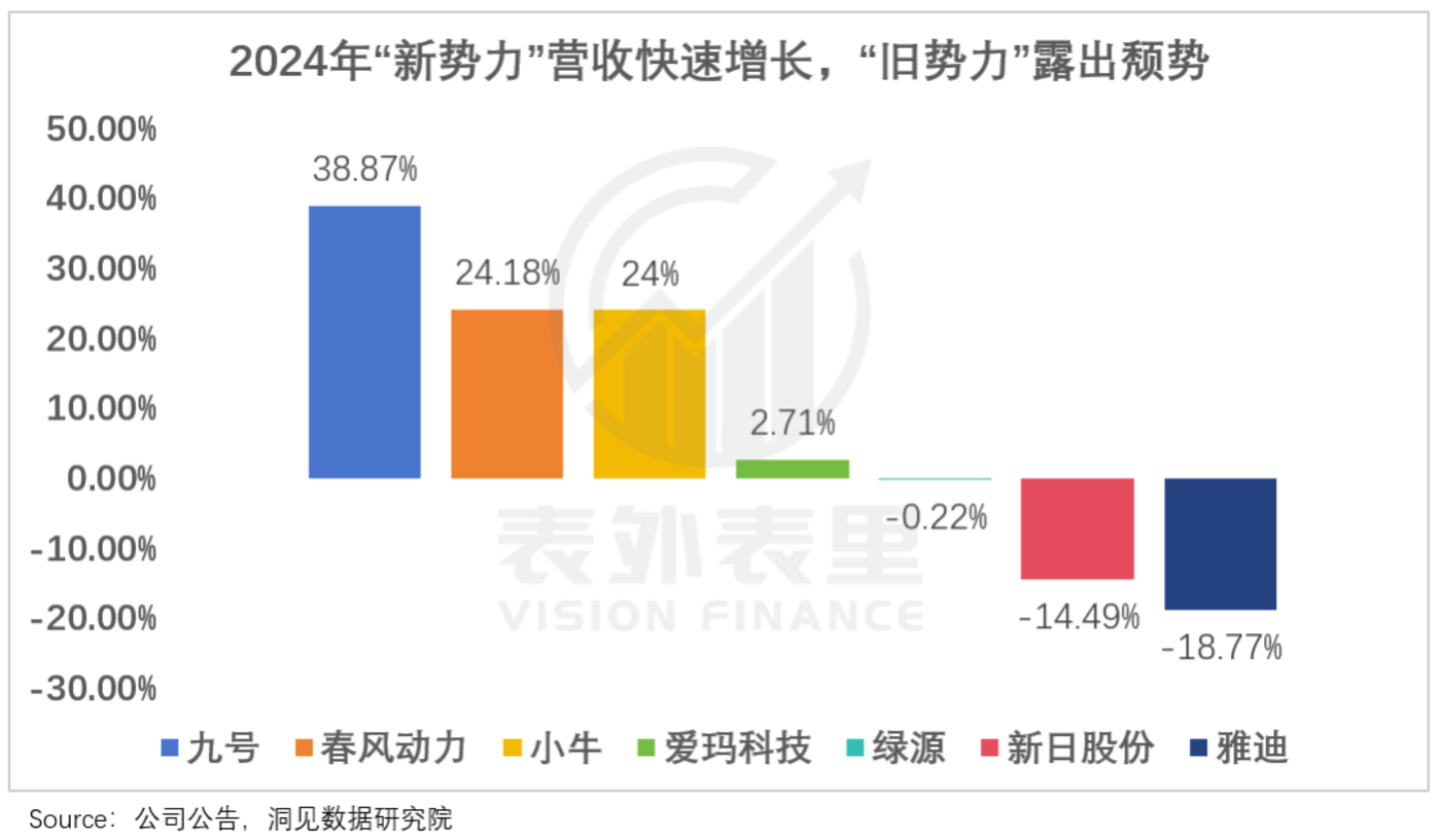 得益于此,去年“九牛极”营收均同比大增20%+,而旧势力纷纷露出颓势。且分化还愈演愈烈,今年618,九号卖出了1个新日,半个绿源,1/6个爱玛(对比2024年营收)。