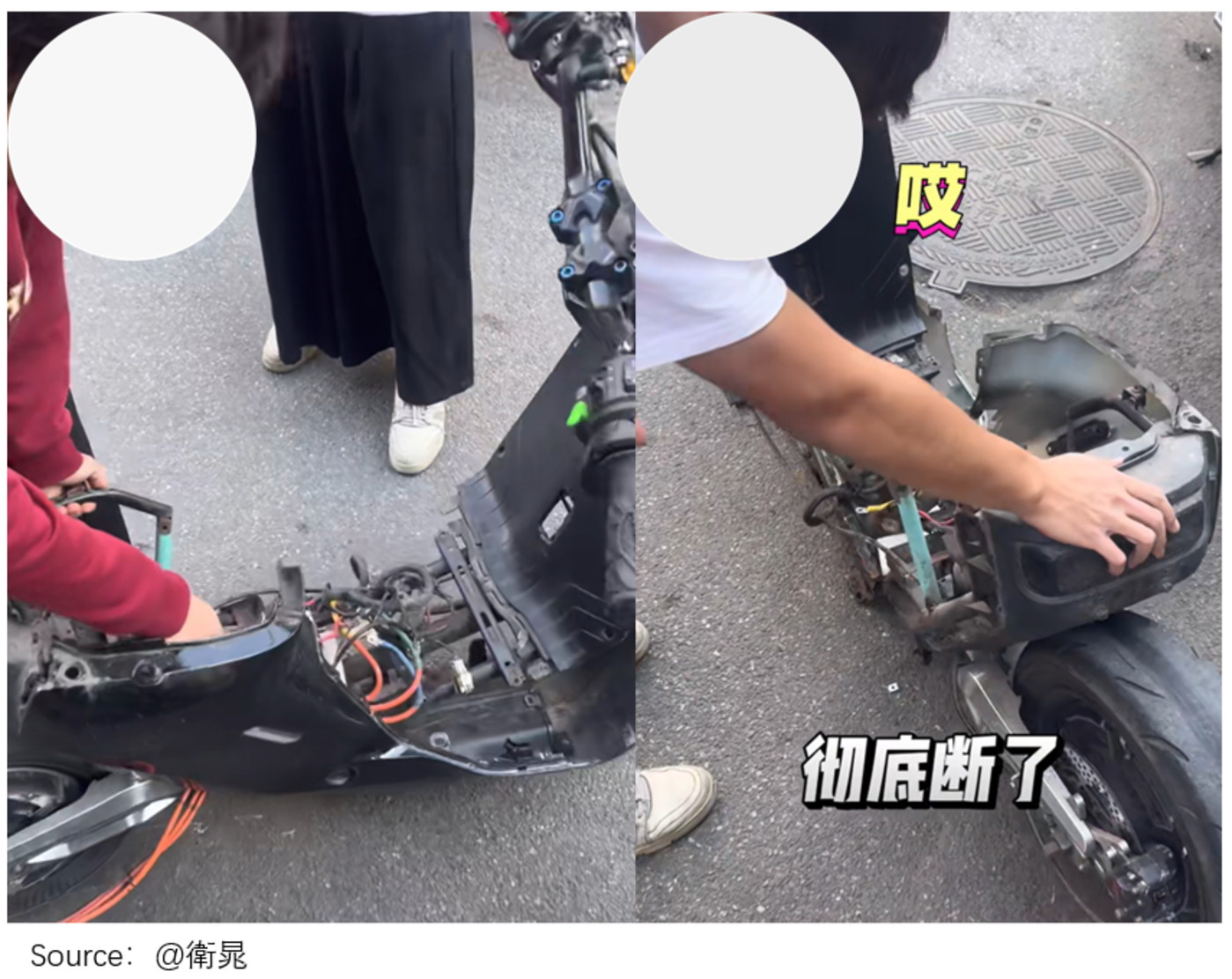 了解后才知道,小电驴新势力为了合规和抢占市场,在用料上“降本”了。比如,此前新国标要求车子限重60kg,厂商便把车架改轻、原装电池改小,留下了性能短板。