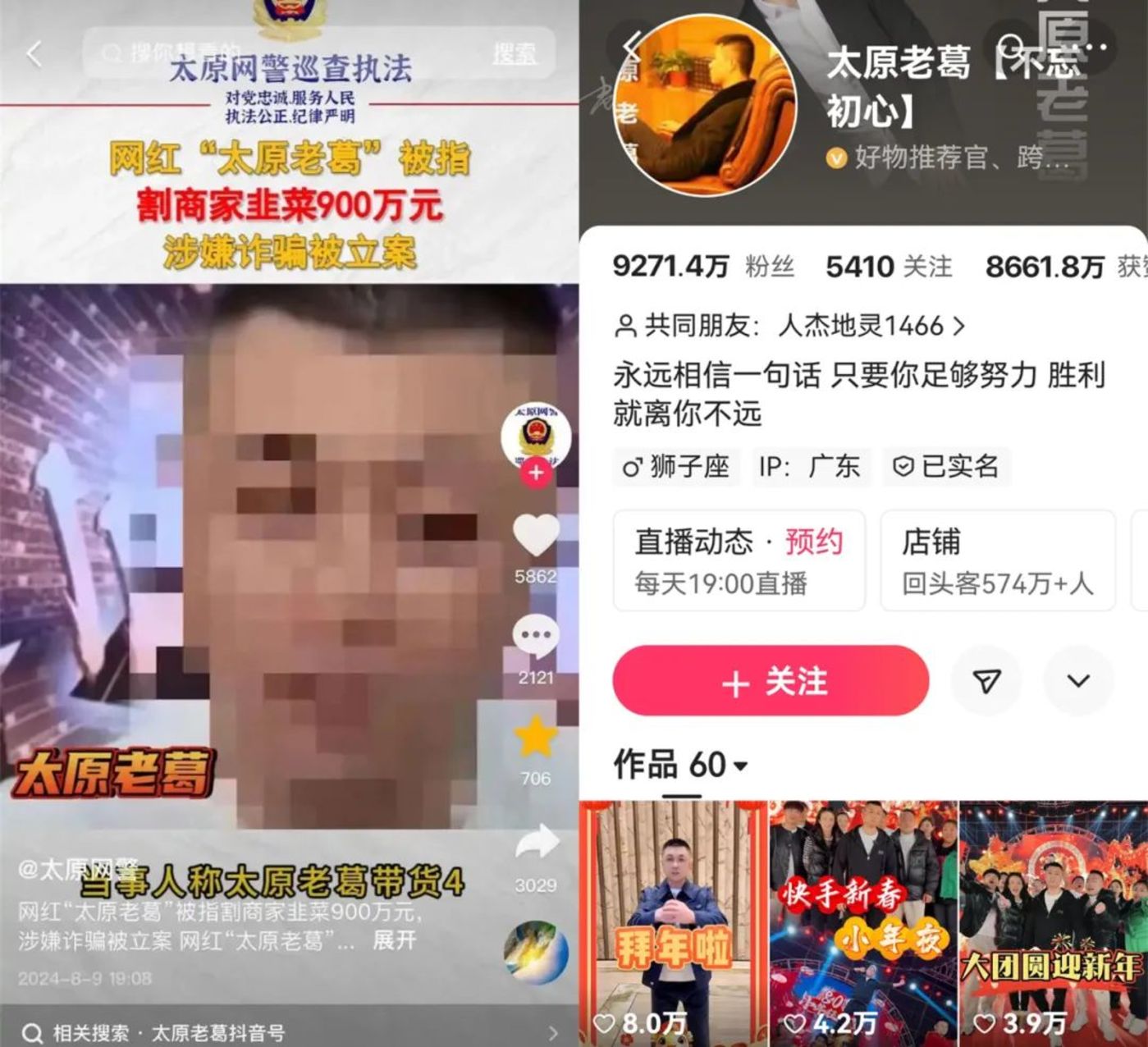 2024年8月9日,抖音号“太原网警”曾发布视频证实,6000万粉丝的快手网红“太原老葛”,被指刷单割商家韭菜900万,涉嫌诈骗被立案。
