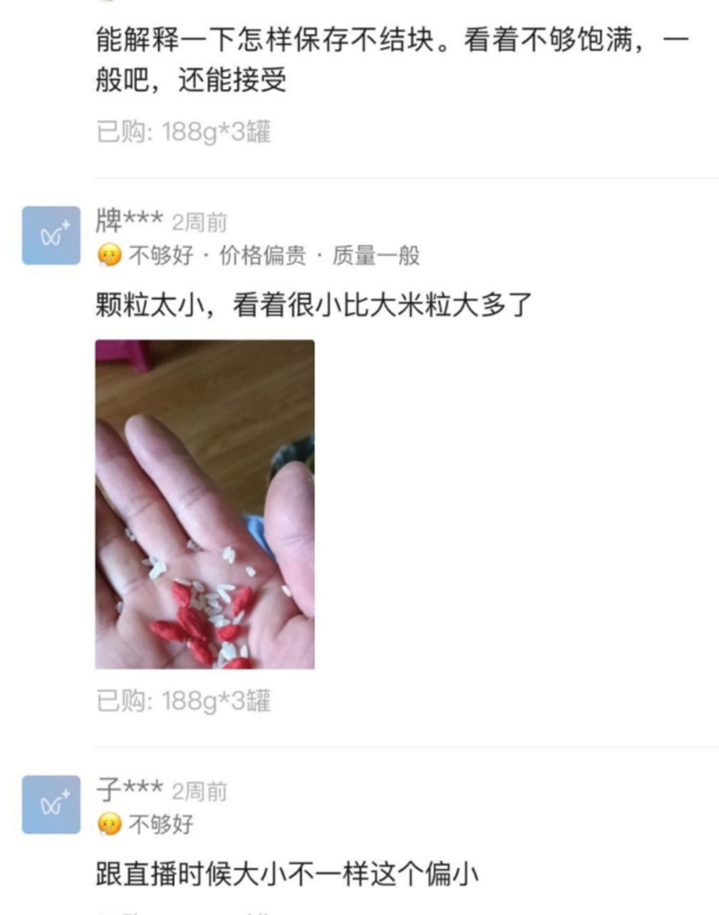 她卖过比直播时的size小很多的枸杞,被评论区吐槽。