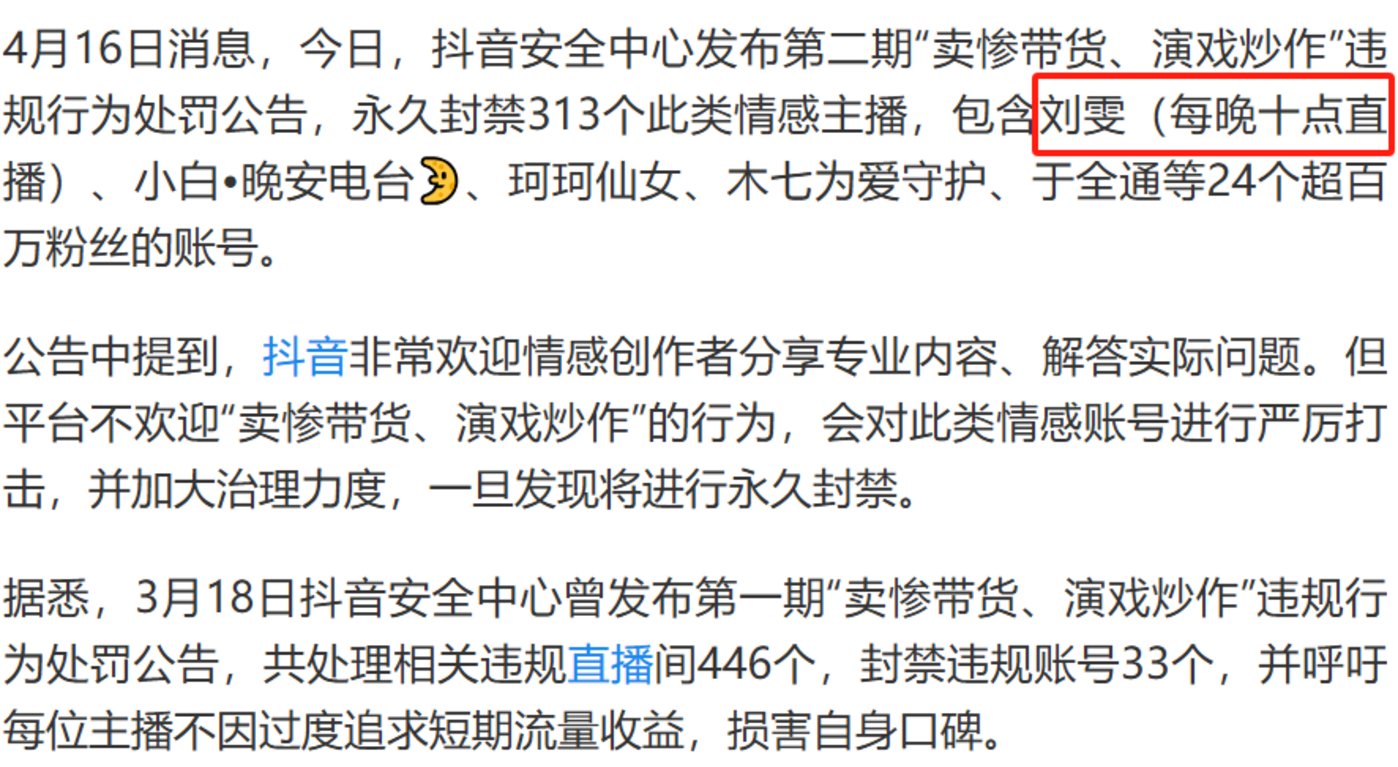 这些顶过她、为她消费的粉丝里,恐怕很少有人知道的一段往事是——2021年,抖音“永久封禁”了313个演戏炒作的情感主播账号,其中排在第一位的就是刘雯。她被封禁的理由是,“卖惨带货、演戏炒作”。