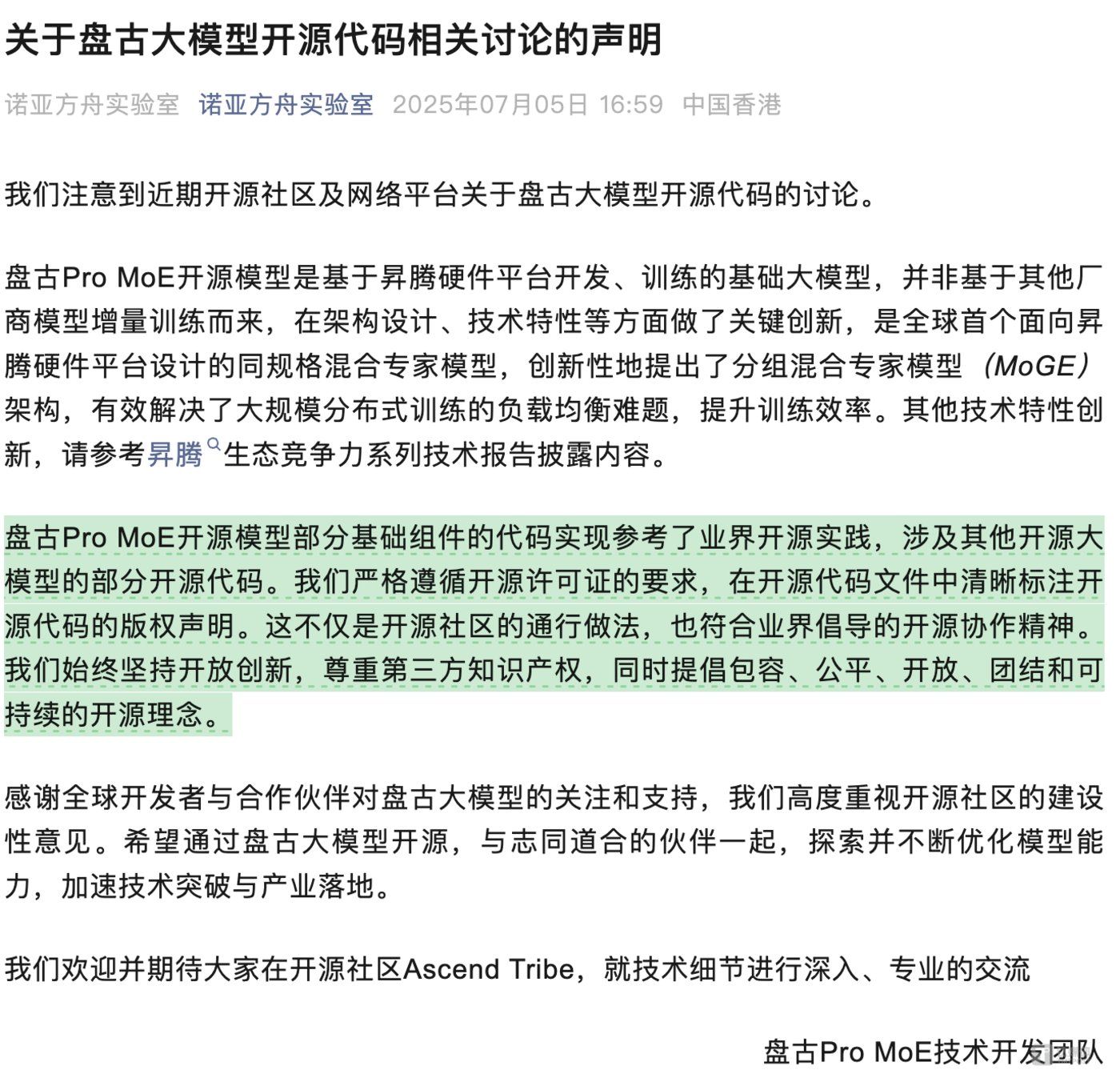 7月5日下午,华为旗下AI大语言模型盘古Pro MoE技术开发团队“诺亚方舟实验室”发布了一份声明,称盘古 Pro MoE开源模型是基于昇腾硬件平台开发、训练的基础大模型,并非基于其他厂商模型增量训练而来。