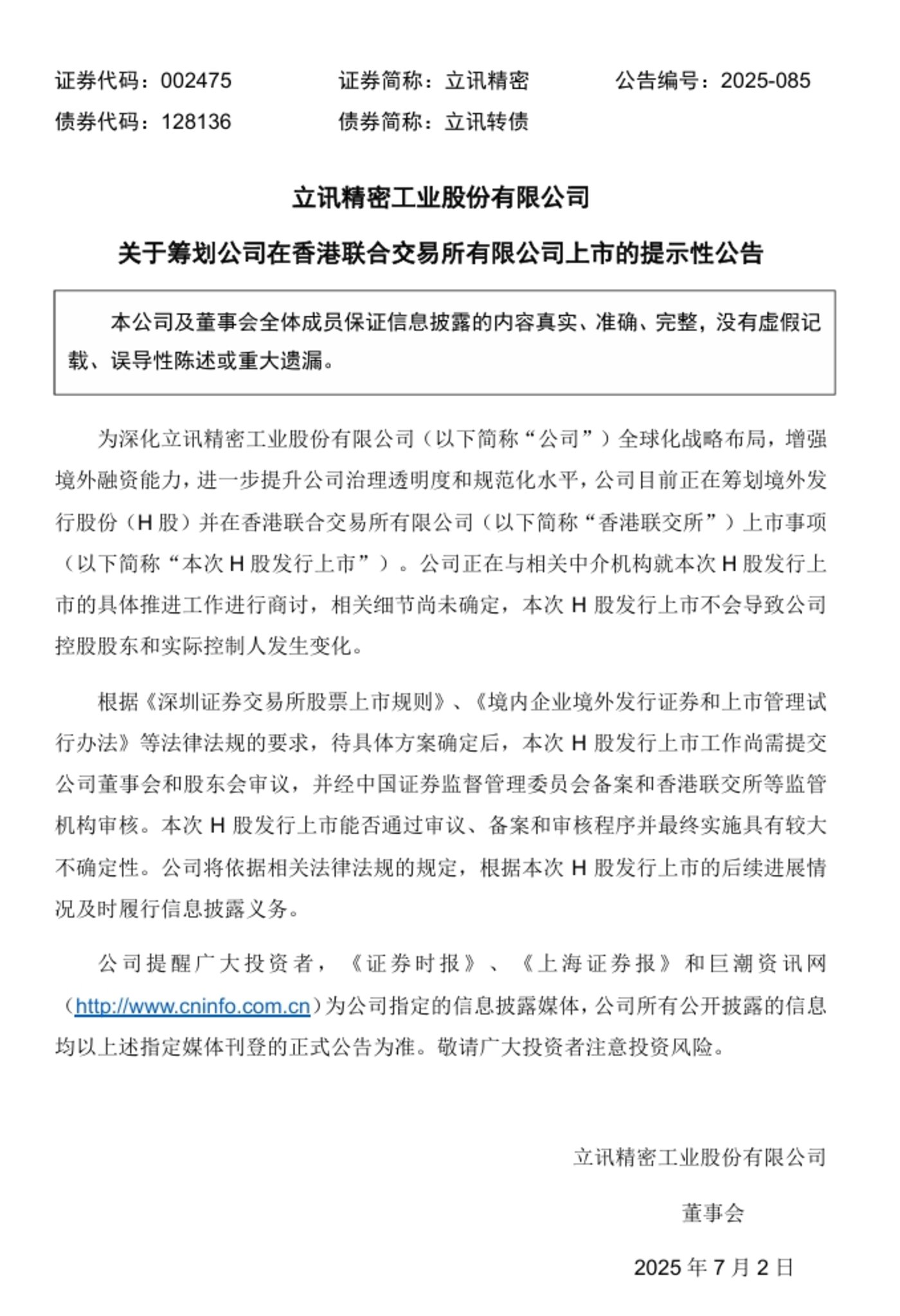7月2日晚,立讯精密公告称,正在筹划境外发行股份(H股)并在香港联交所上市事项。