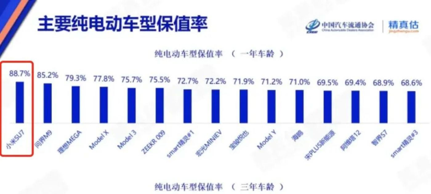 相关数据显示,2025年4月,主要纯电动车保值率榜单中,小米SU7一年车龄保值率达到88.7%,排在榜首。很大一部分原因是,在价格战火热的当下,小米SU7上市一年多,没有降价。较高的保值率意味着消费者在未来换车时能够减少损失,从长期来看,增加了车辆的性价比。
