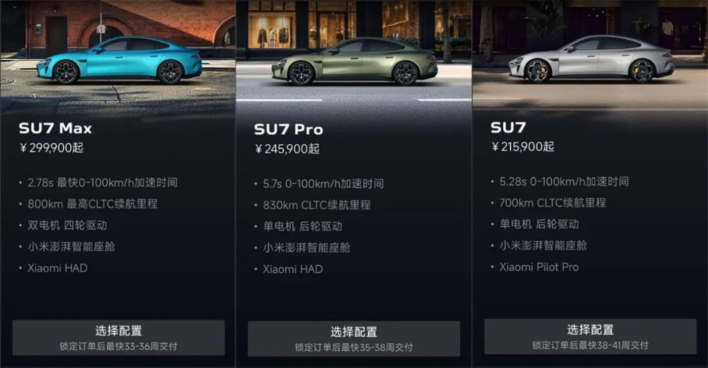 小米汽车App显示,小米SU7标准版、SU7 Pro版和SU7 Max版锁定订单后最快交付时间分别为38-41周、35-38周和33-36周。