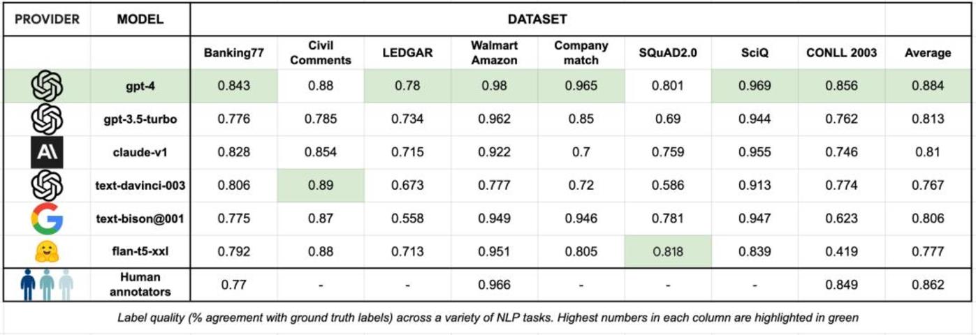 各种NLP任务中模型标注相比人类标注的标签准确度(与真实标签的吻合度)明显更高。每一列中数值最高者以绿色突出显示。